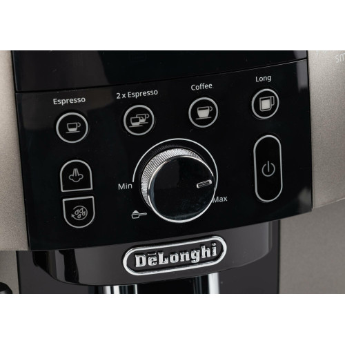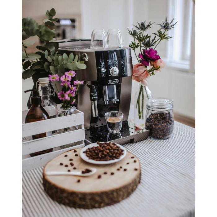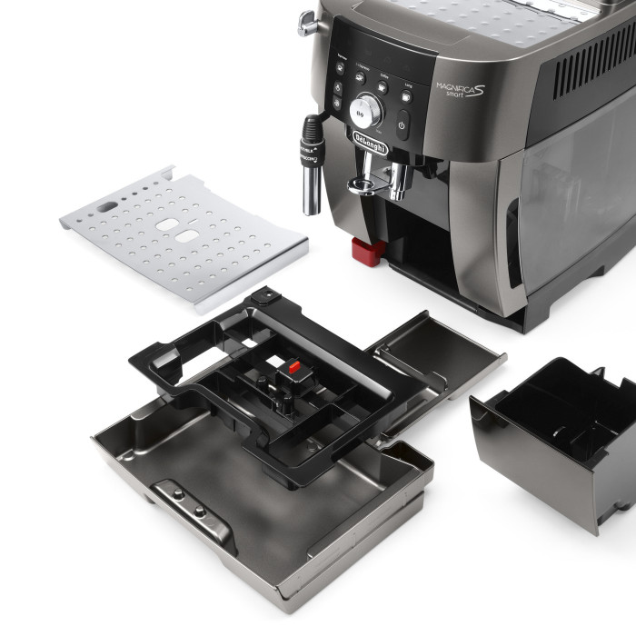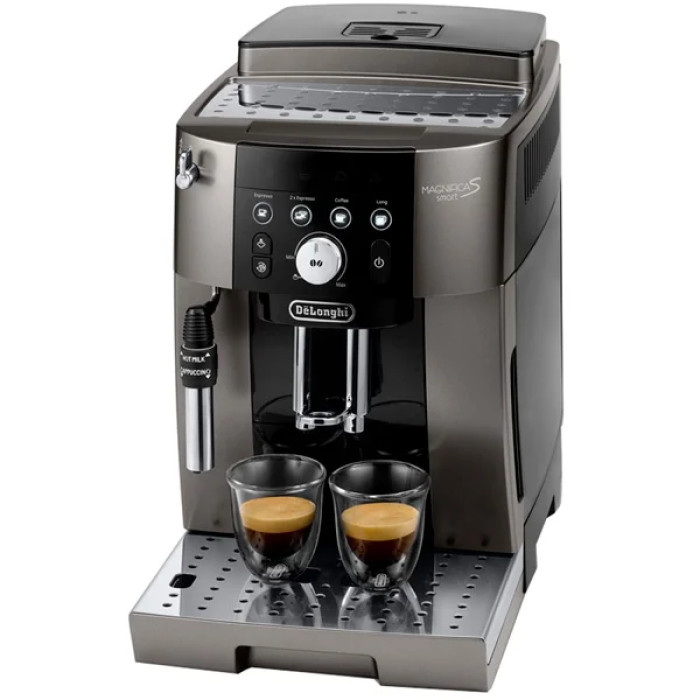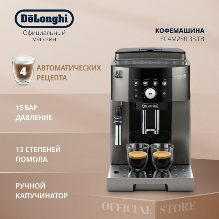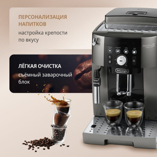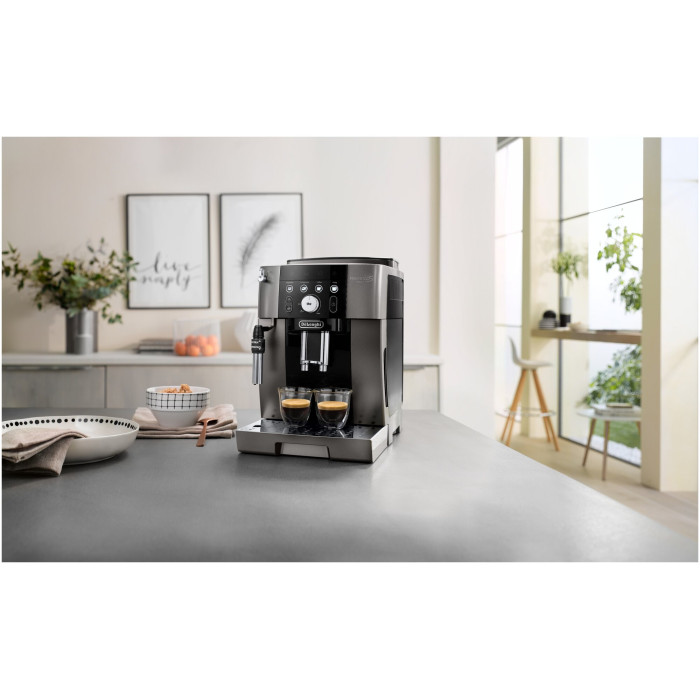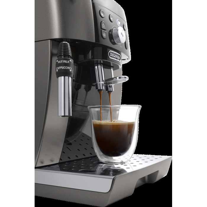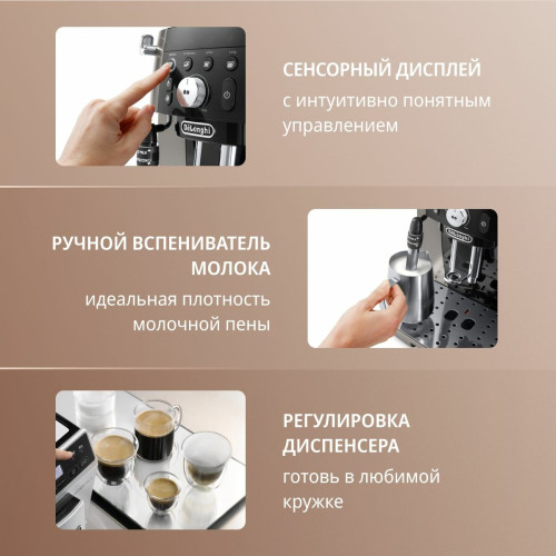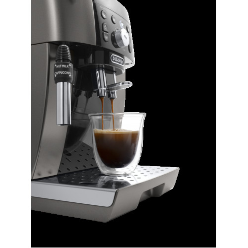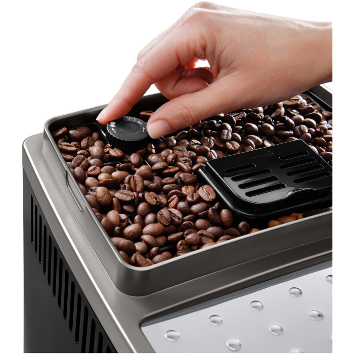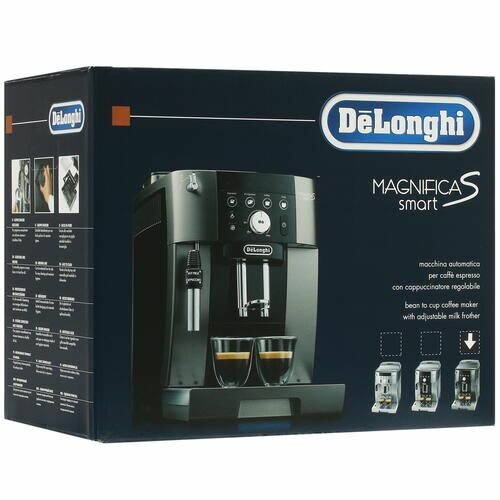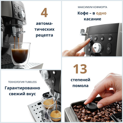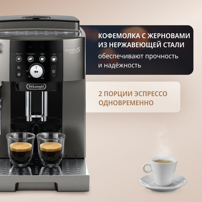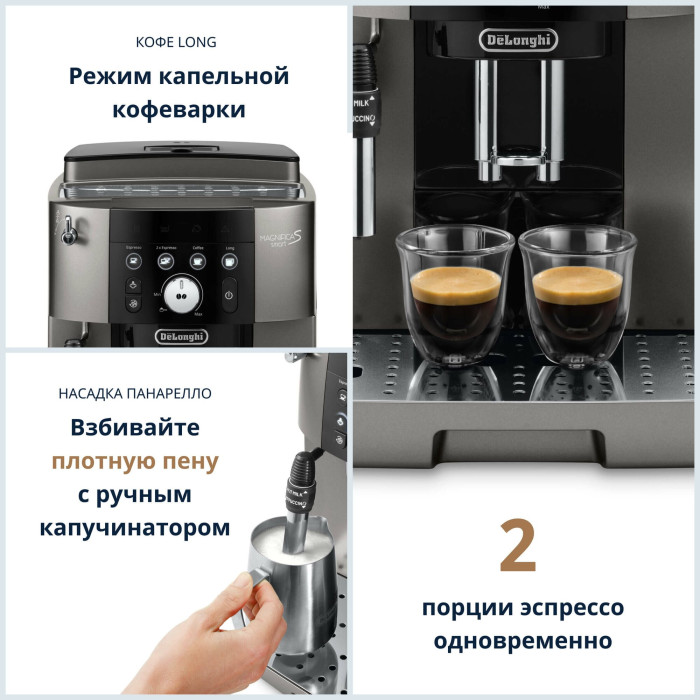 насадка панарелло, режим энергосбережения, регулируемая высота кофейного адаптера 86-142 мм, материал жерновов - нержавеющая сталь, 5 уровней крепости; комплектация: мерная ложка, смягчающий фильтр, средство для удаления накипи, индикаторная полоска