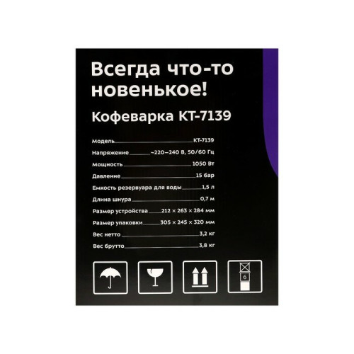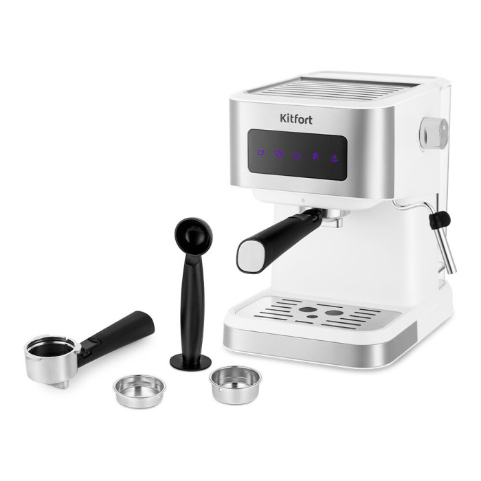 Комплектация: 1. Кофеварка — 1 шт. (резервуар для воды — 1 шт.; поддон для капель со съемной решеткой — 1 шт.) 2. Рожок — 1 шт. 3. Одинарный фильтр (single) — 1 шт. 4. Двойной фильтр (double) — 1 шт. 5. Мерная ложка-темпер — 1 шт. 6. Насадка панарелло — 1 шт. 7. Ручка стимера — 1 шт.