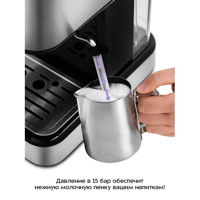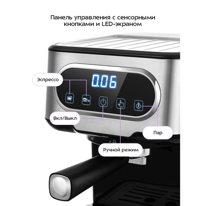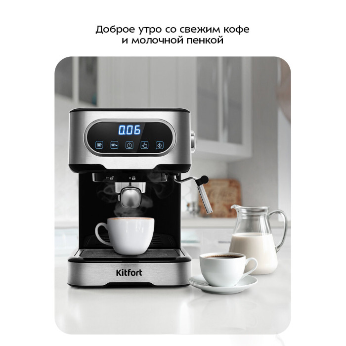 Длина сетевого шнура: 0.85. Индикация включения. Модель:КТ-765. Габаритные размеры (В*Ш*Г): 30*22.7*27.4 см. Тип дисплея: LED. Таймер выключения. Индикация готовности к работе. Автоматическое отключение. Мерная ложечка. Подсветка кнопок: голубая. Съемный резервуар для воды. Использование молотого кофе. Приготовление кипятка. Трубка подачи пара. Регулировка положения трубки. Способ вспенивания молока: ручной. Возможность приготовления 2 чашек. Максимальная высота чашки: 9. Рожок с клапаном давления. Съемный поддон для капель. Съемный резервуар для капель. Материал решетки каплесборника: нержавеющая сталь. Количество металлических фильтров: 1. Нагревательных элементов: 1. Регулировка порции воды. Насадка панарелло. Система вспенивания молока. Объем резервуара для капель: 100. Индикация необходимости очистки от накипи. Программа объема большой чашки. Приготовление горячего молока