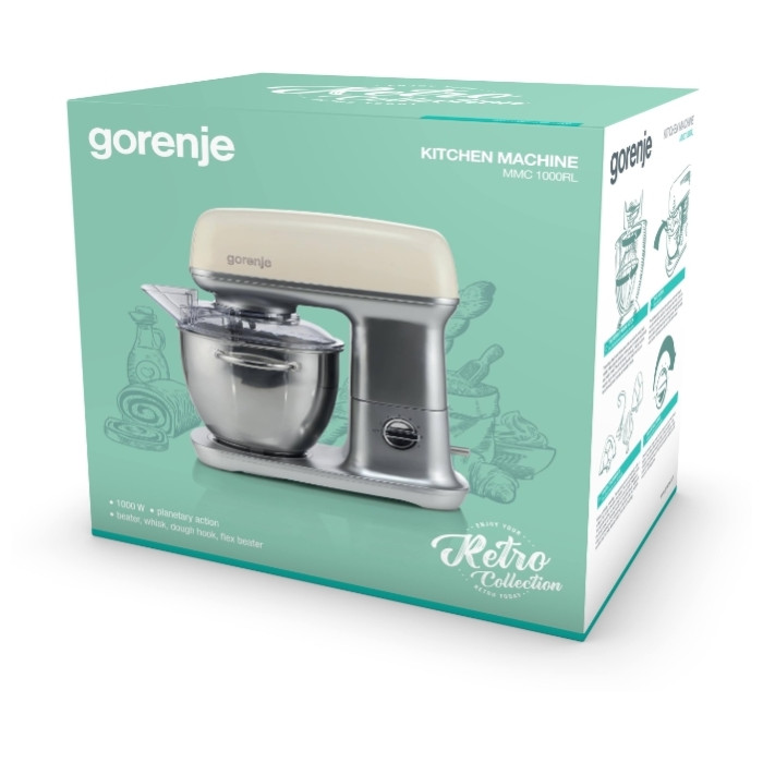 коллекция Retro; авторегулировка скорости смешивания в зависимости от смеси; отверстие в крышке для добавления ингредиентов в процессе перемешивания; ручка на чаше; возможность приобретения дополнительных насадок для расширения функциональности прибора: