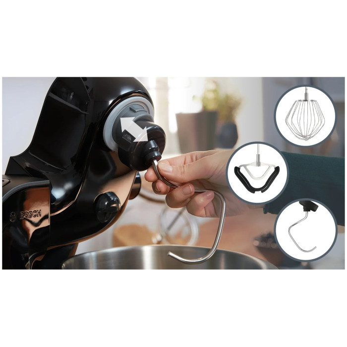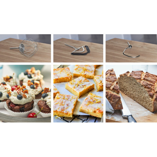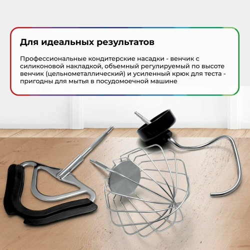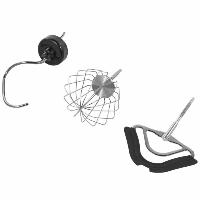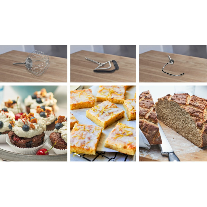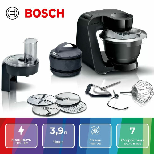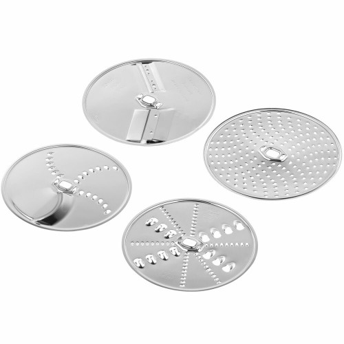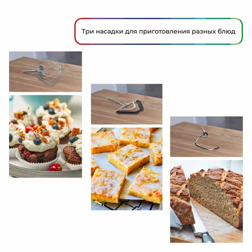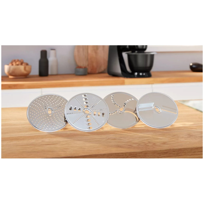 кухонный комбайн - 1 шт, шинковка - 1 шт, терка - 1 шт, венчик для взбивания - 1 шт, венчик для жидкого теста - 1 шт, крюк для теста, терка мелкая - 1 шт, инструкция - 1 шт, чехол - 1 шт, кожух для защиты от брызг - 1 шт