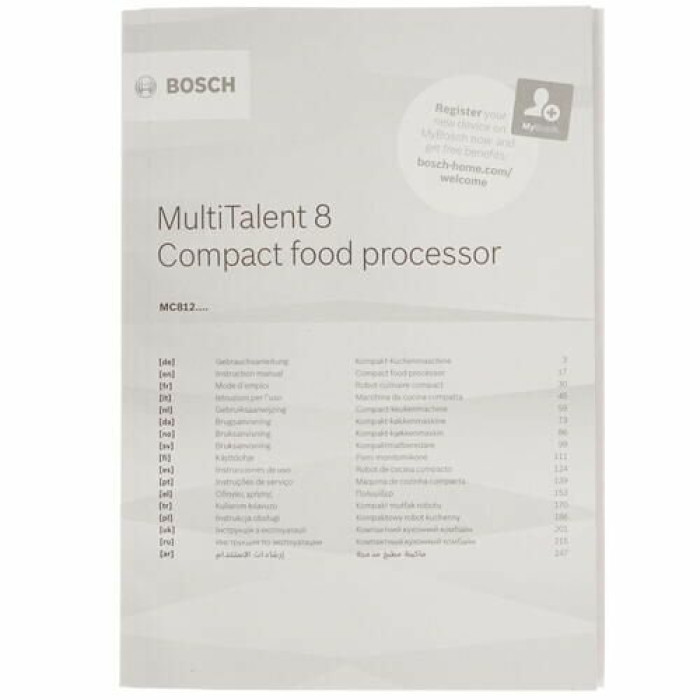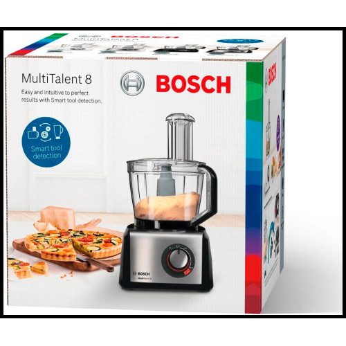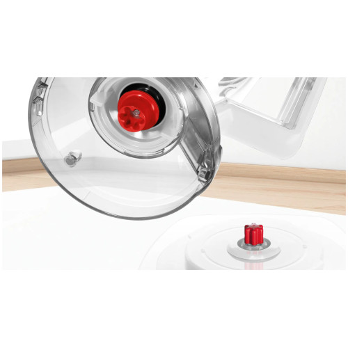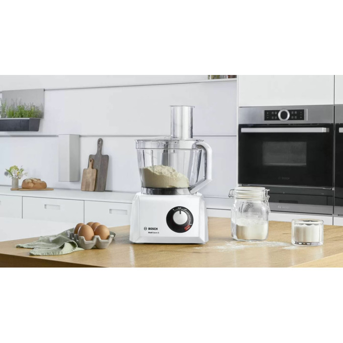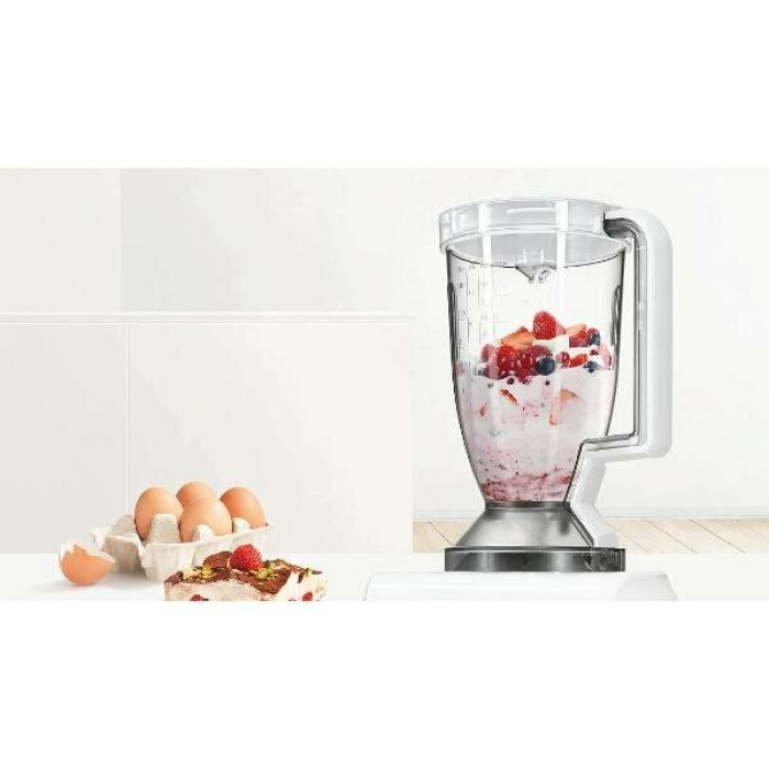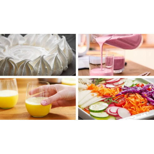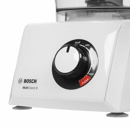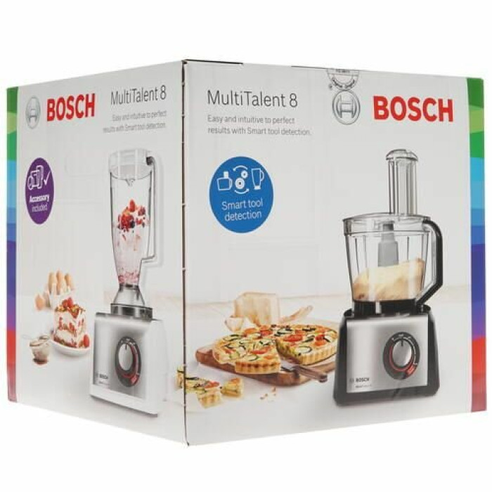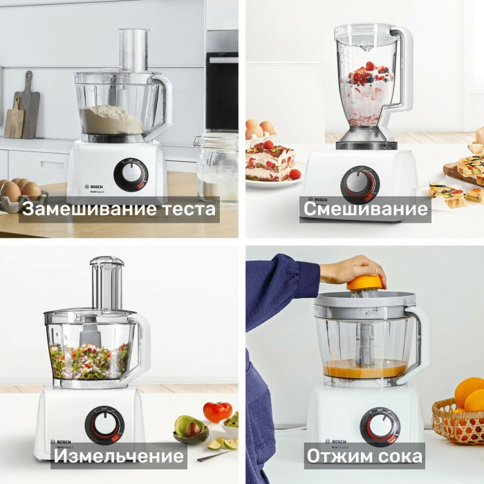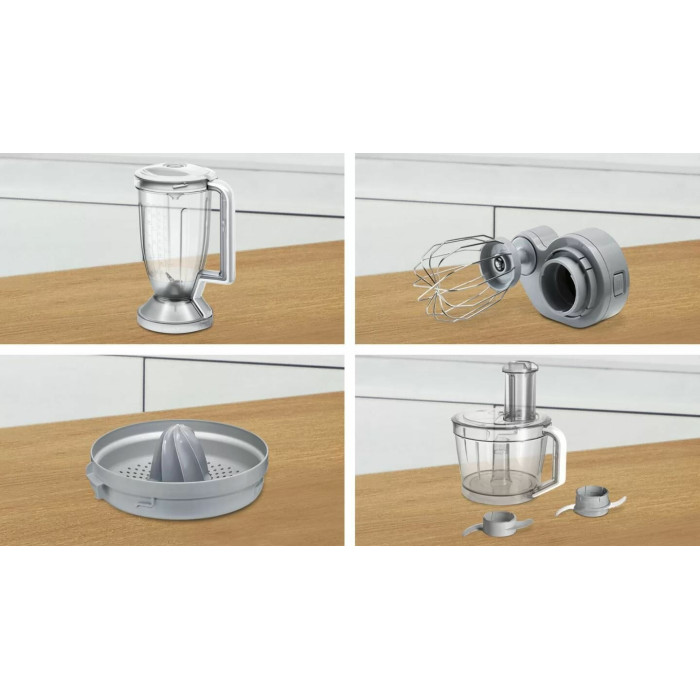 Большая пластиковая чаша с крышкой и толкателем, объем 3,9л для 750гр муки + ингредиенты (макс. 1.5 кг) Блендер (пластик), объем 1,5 л Двухсторонний диск - шинковка (крупная/мелкая), двухсторонний диск - терка (крупная/мелкая) Диски из нержавеющей стали Держатель дисков Насадка для замеса теста (пластик) Венчик из нерж. стали для взбивания крема, яичных белков и легкого теста Пресс для приготовления сока из цитрусовых