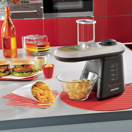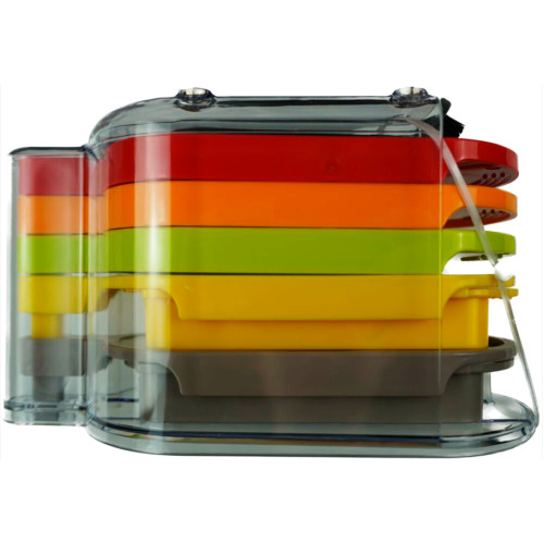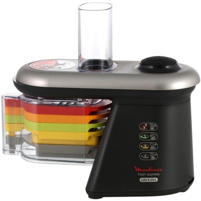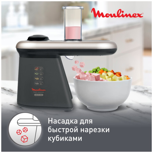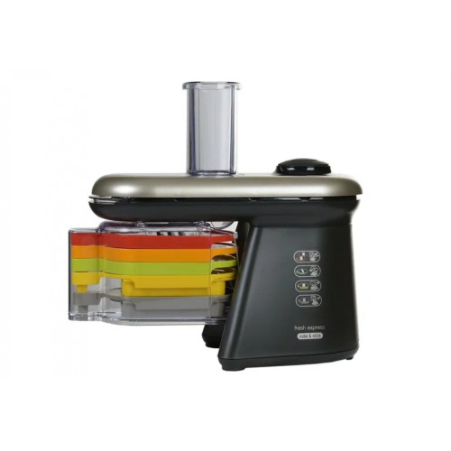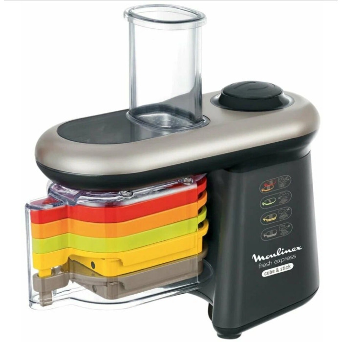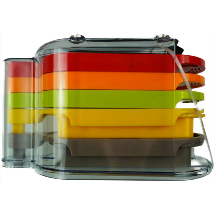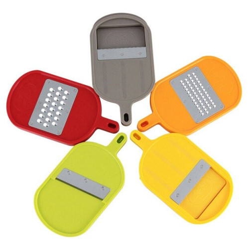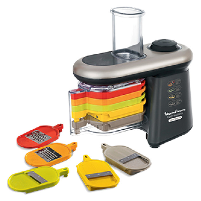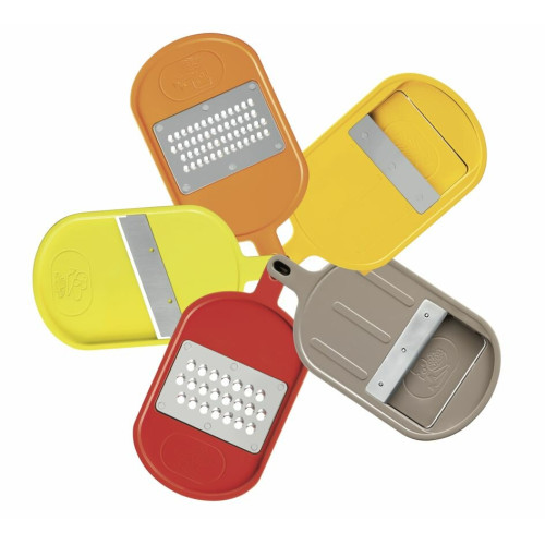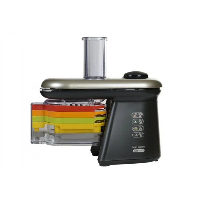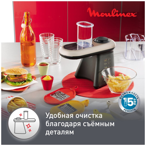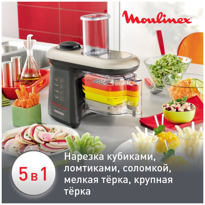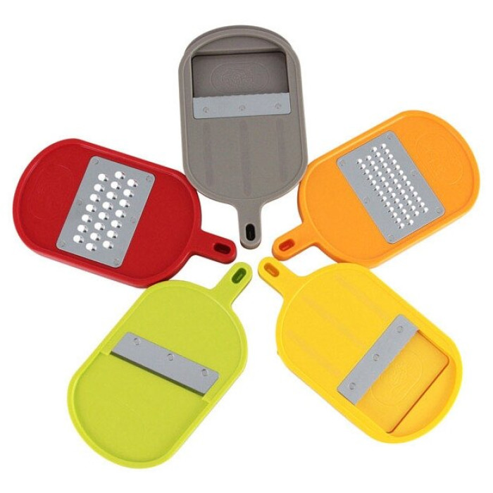 - вставка для крупной терки; - вставка для мелкой терки; - вставка для шинковки; - вставка для нарезки тонкой соломкой; - вставка для нарезки кубиками; - толкатель; - щетка для чистки.