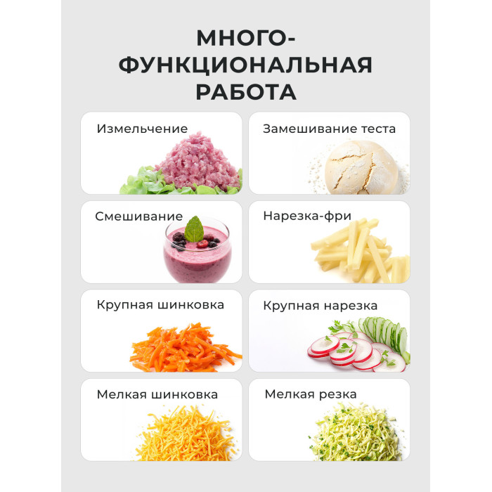 Чаша для обработки продуктов 1 шт., Крышка 1 шт., Приводной вал 1 шт., Держатель ножа и насадки для замешивания теста 1 шт., Диск-нож для нарезки картофеля фри 1 шт., Двусторонний диск-нож для крупной нарезки и шинковки 1 шт., Двусторонний диск-нож для мелкой нарезки и шинковки 1 шт., Нож для измельчения 1 шт., Насадка для замешивания теста 1 шт., Толкатель 1 шт., Книга рецептов 1 шт.