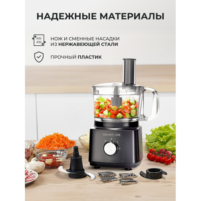 Номинальная потребляемая мощность 900 Вт 2 скорости работы и импульсный режим Пластиковая чаша объемом 2 л 7 насадок для обработки продуктов: