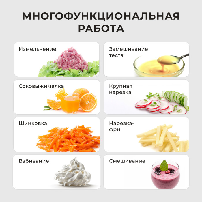 Нож для измельчения из нержавеющей стали, Насадка для замешивания теста, 2 насадки для крупной нарезки и крупной шинковки, Насадка из нержавеющей стали для нарезки картофеля фри, Насадка-венчики для взбивания, Насадка-соковыжималка для цитрусовых, Насадка для перемешивания