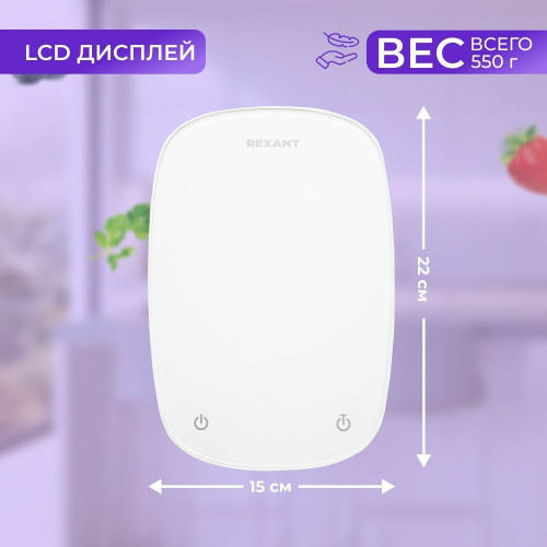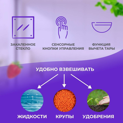 автоматическое включение, автоматическое выключение, тарокомпенсация, Память предыдущего взвешивания, Светящиеся символы дисплея, Сенсорное управление
