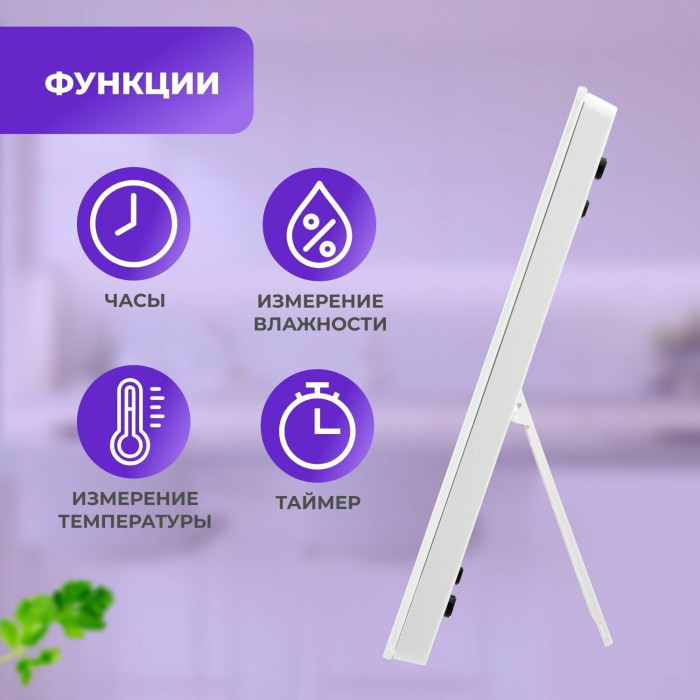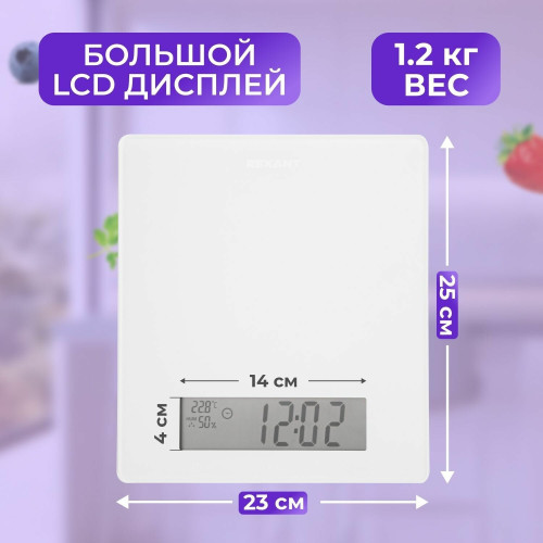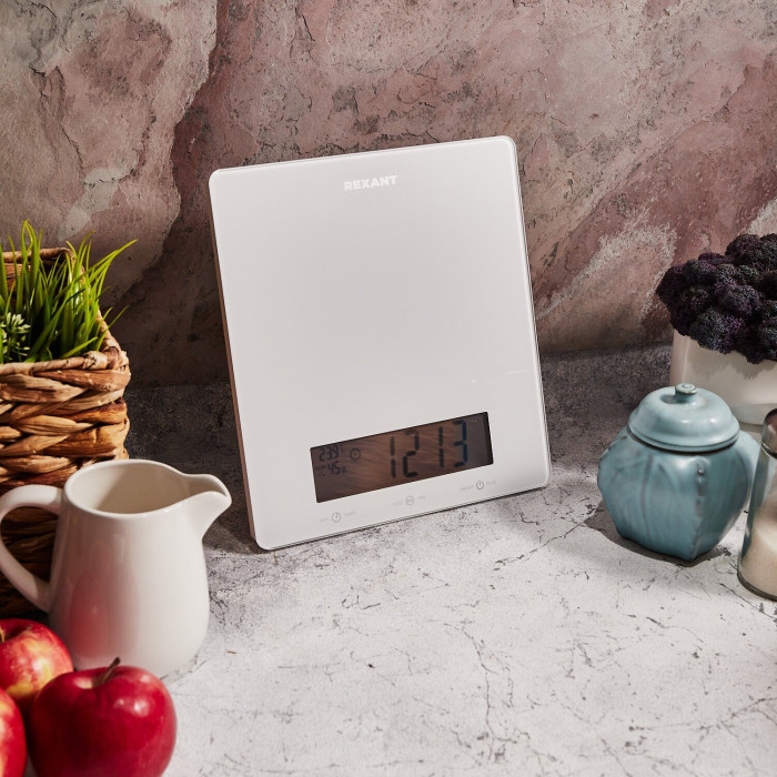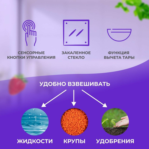 автоматическое включение, автоматическое выключение, тарокомпенсация, Встроенный термометр, Светящиеся символы дисплея, Сенсорное управление
