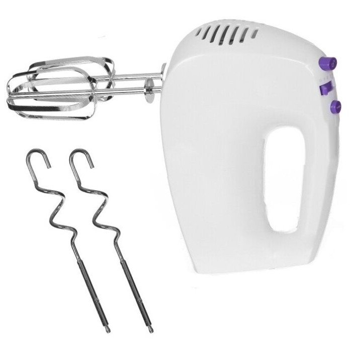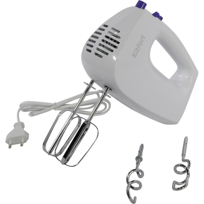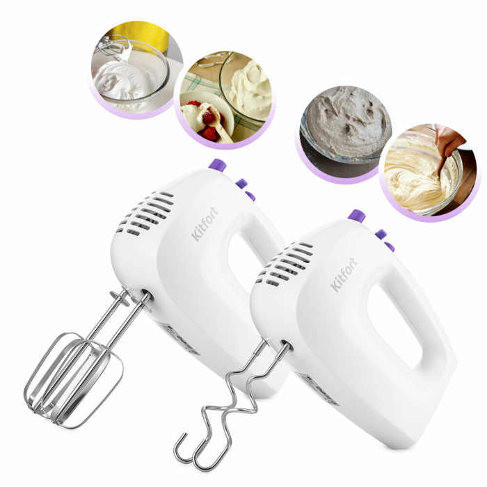 Комплектация 1. Миксер — 1 шт. 2. Венчик для взбивания — 2 шт. 3. Крюк для замеса — 2 шт.