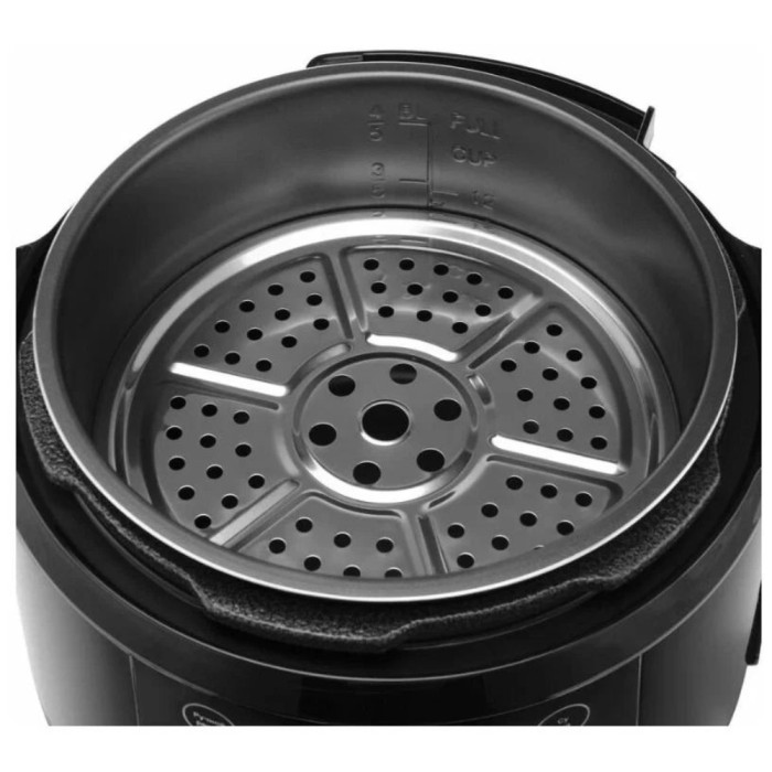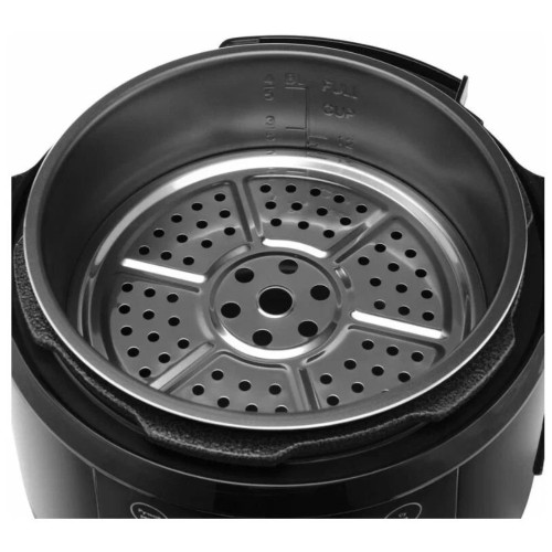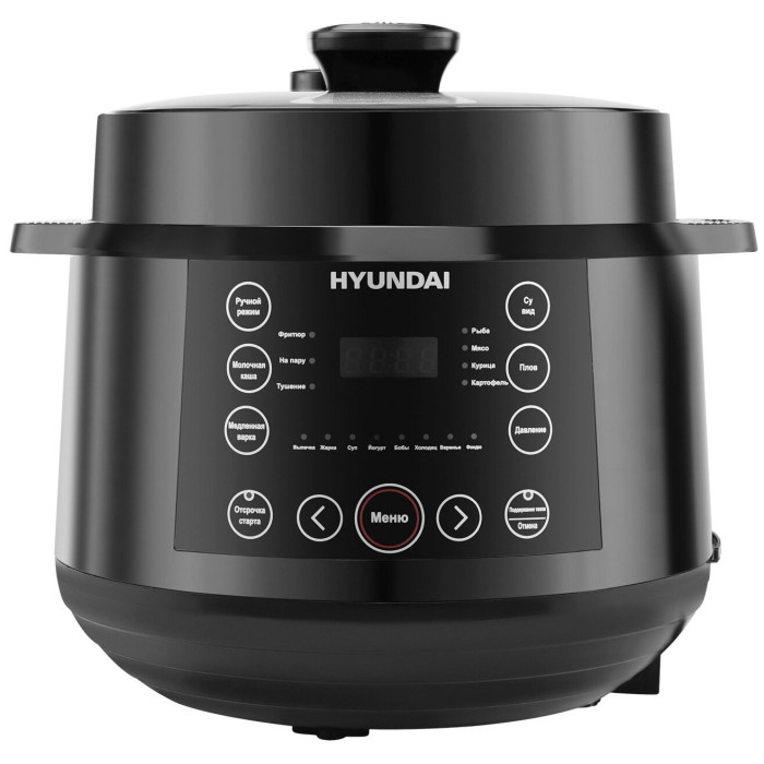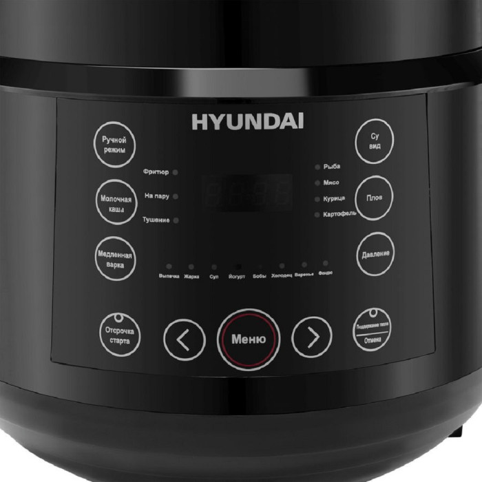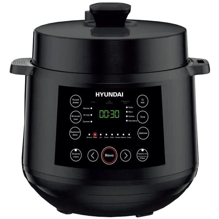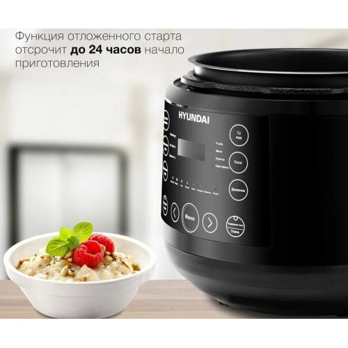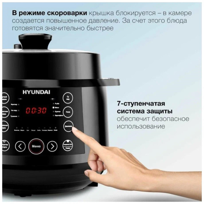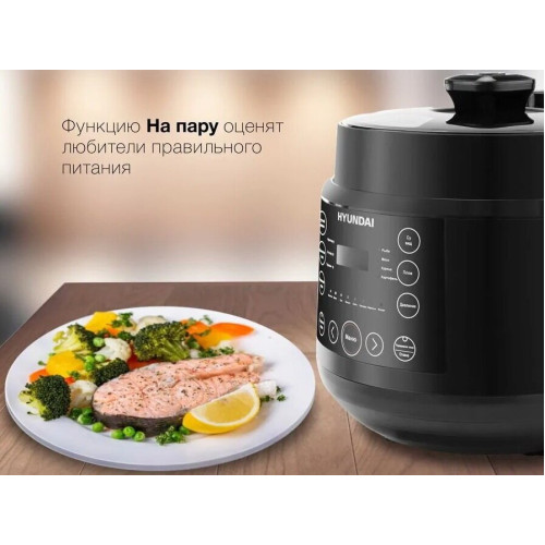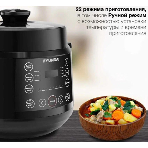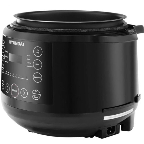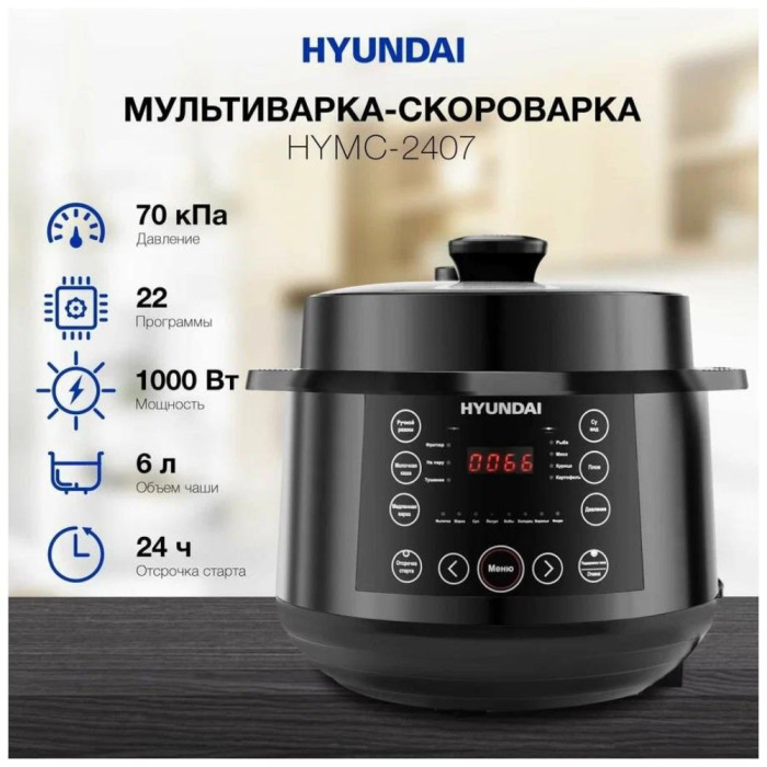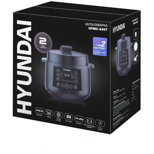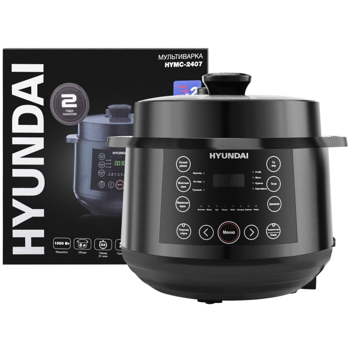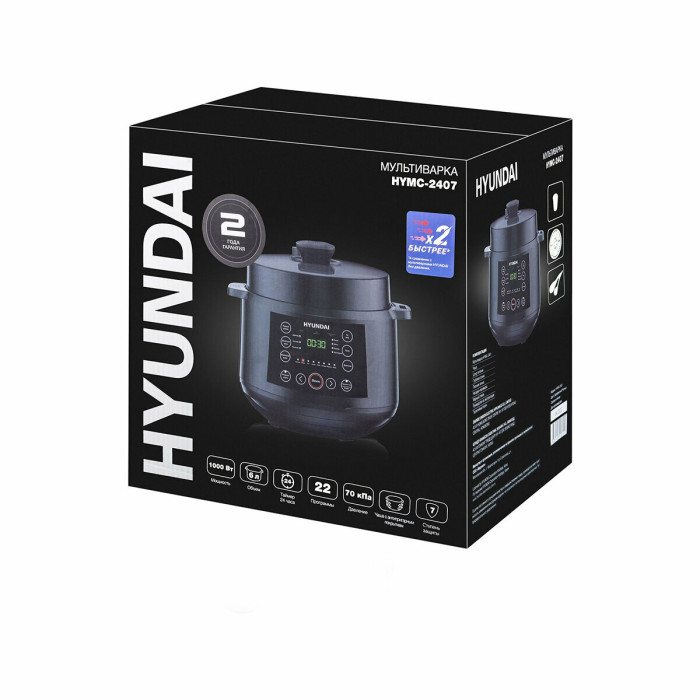 Hyundai HYMC-2407 – это электронный шеф-повар, который приготовит практически любое блюдо за кратчайшее время. Вариативность программ данной модели порадует даже самого искушенного гурмана. В её вместительной шестилитровой чаше можно варить, готовить на пару, жарить, томить, тушить. Или же просто выставить предустановленный режим для конкретного блюда. Молочные каши, плов и даже йогурты и варенья получаются в Hyundai HYMC-2407 вкусными, ничем не хуже аналогичных, но приготовленных вручную. С внутренней стороны тара прибора отделана антипригарным покрытием и имеет насечки для чёткого следования рецептуре по граммовкам. В комплекте с мультиваркой идёт эргономичная пароварка, встраиваемая прямо поверх основной чаши без каких-либо усилий. Помимо этого, Hyundai HYMC-2407 может работать в режиме скороварки. Во время его активации крышка блокируется для создания повышенного давления. Блюда в подобных условиях готовятся значительно быстрее. В выключенном виде верх мультиварки снимается с тары полностью – это облегчает сервировку. Настройка работы Hyundai HYMC-2407 осуществляется с помощью интуитивных органов управления. Все необходимые кнопки вынесены на переднюю панель, а текущая программа отображается на ярком и разборчивом жидкокристаллическом экране. Также прибор поддерживает функцию отсроченного старта готовки до 24 часов. С помощью неё возможно приготовить свежие блюда точно к нужному моменту. Например, потушить мясо прямо к приходу гостей. Стандартное время готовки для каждой программы можно изменить на своё усмотрение в специально предусмотренном ручном режиме. Чтобы обеспечить безопасность использования мультиварки, она оснащена семиступенчатой защитой.