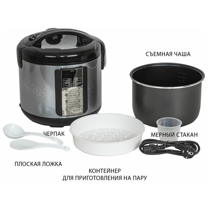 мультиварка, внутренняя чаша, съемный шнур, контейнер для варки на пару, плоская ложка, книга рецептов, гарантийный талон, мерная чашка, руководство по эксплуатации