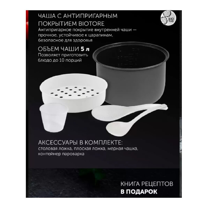 Cтоловая ложка, мерная чашка, контейнер пароварки, книга рецептов