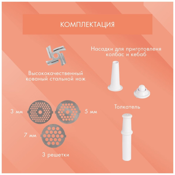 толкатель; дополнительная защита двигателя; металлическое соединение головки; материал лотка: пластик; количество насадок для приготовления колбас: 1