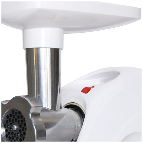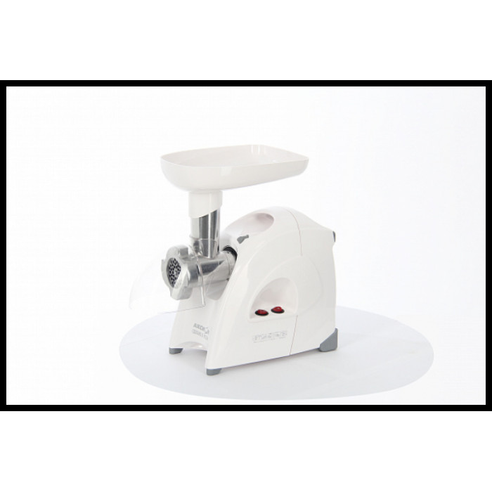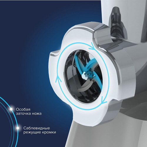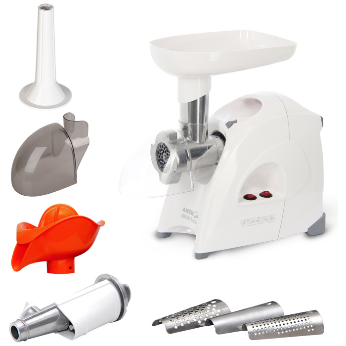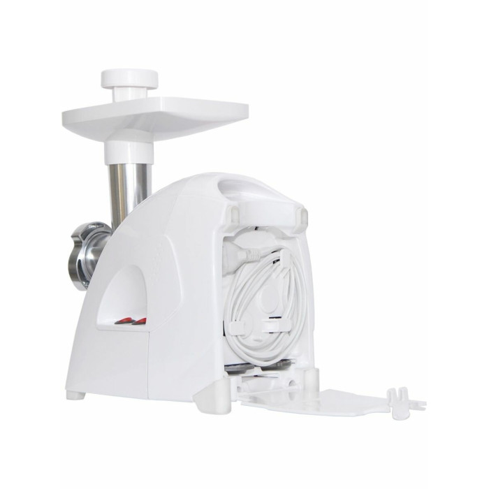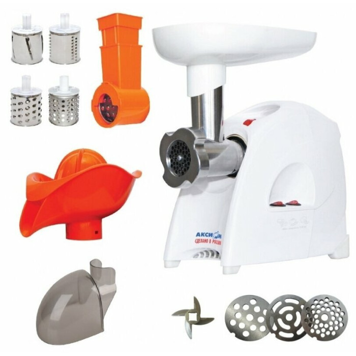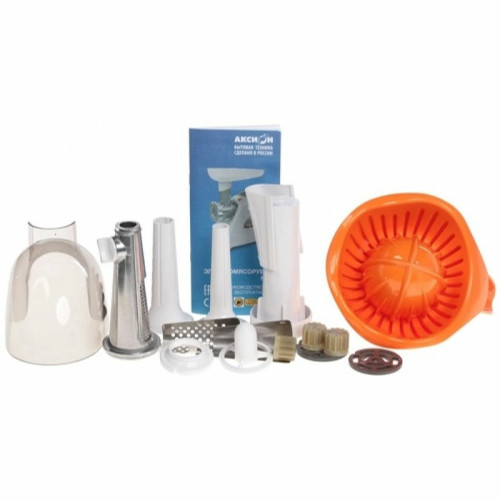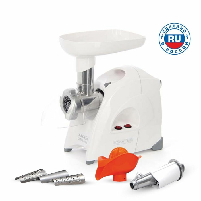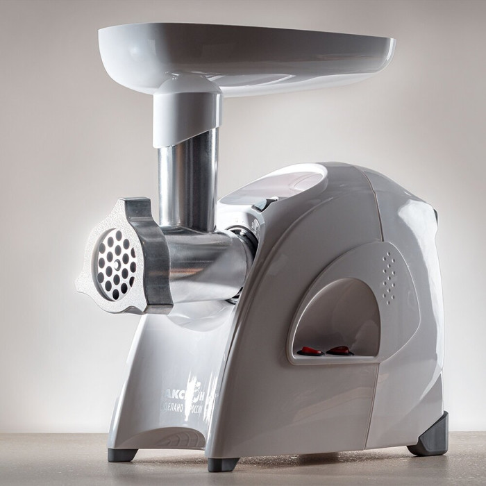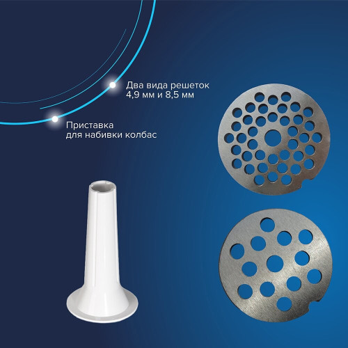 материал лотка: пластик; экран для защиты от брызг, который поможет сохранить кухню в чистоте; 3 вида решеток для получения фарша разной консистенции - с диаметром отверстий 4,9 мм и 7 мм, а также овальными отверстиями