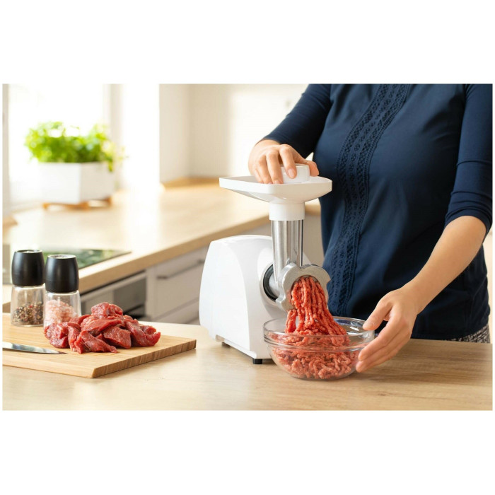 Артикул № 1006693 Мясорубка быстро и легко измельчит различные виды мяса. В комплект входит 1 решетчатый диск с крупными отверстиями (овальные отверстия), измельчающий нож и диск изготовлены из прочной стали. Мощность данной модели составляет 500 Вт, что обеспечивает производительность до 30 кг в час.
