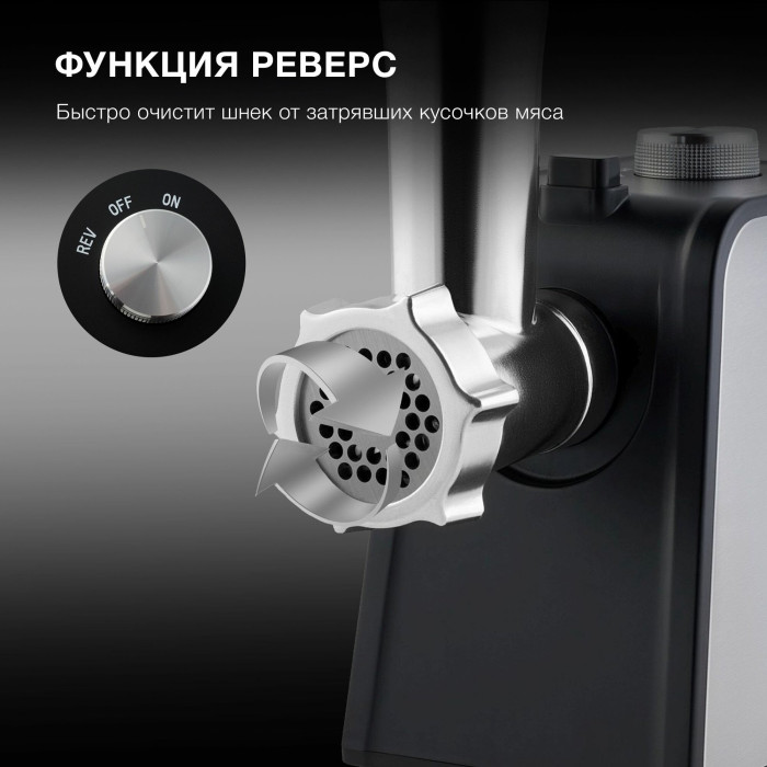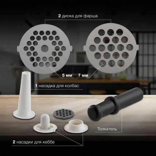 Мясорубка; диск с отверстиями диаметром 5 мм; диск с отверстиями диаметром 7 мм; насадка для колбас; насадка для кеббе; инструкция с гарантийным талоном