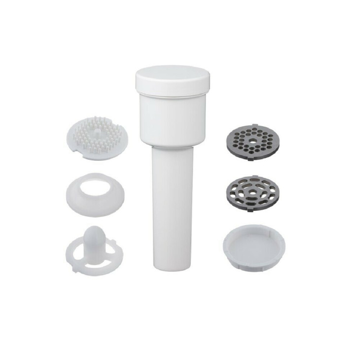 Защита от перегрузки (автоматический предохранитель), насадки для приготовления колбас, реверс, система блокировки, толкатель, электромясорубка с насадками