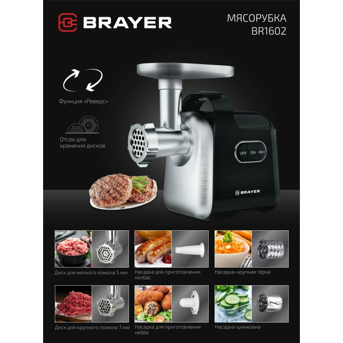защита от перегрузки, Прорезиненные противоскользящие ножки., защита двигателя от перегрузки, насадки для приготовления колбас, система реверса, толкатель