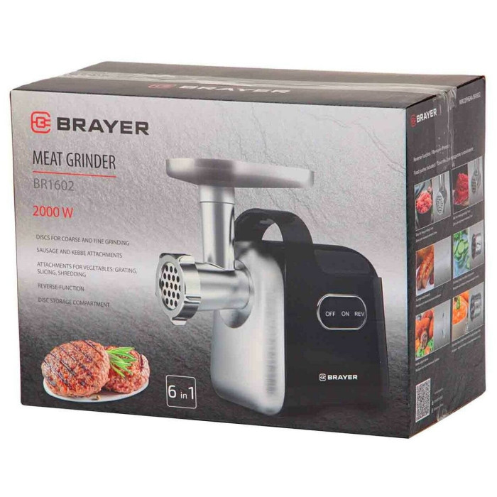 Насадки: Для колбас/сосисок, Для котлет, Овощерезка, Терка, Шинковка, Для фарша, Кеббе