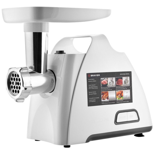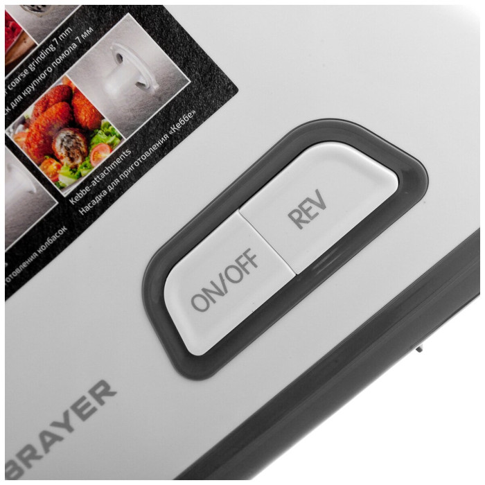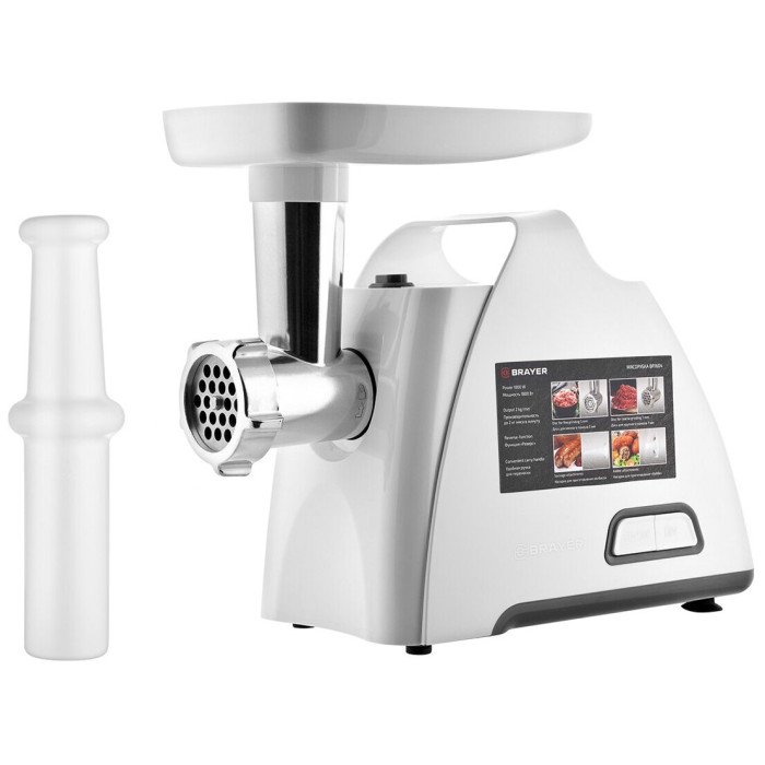 защита от перегрузки, прорезиненные ножки, насадки для приготовления колбас, толкатель