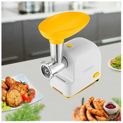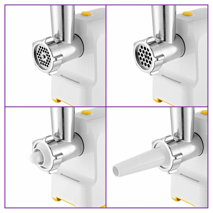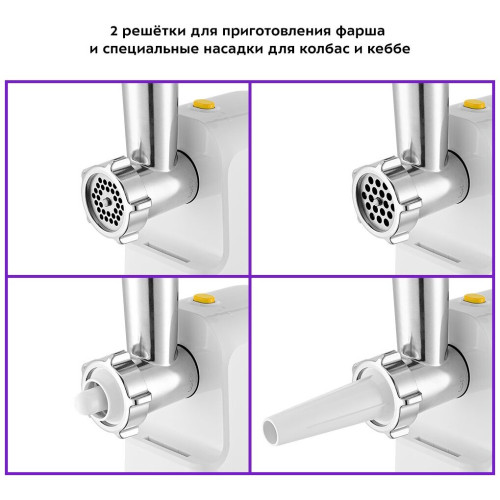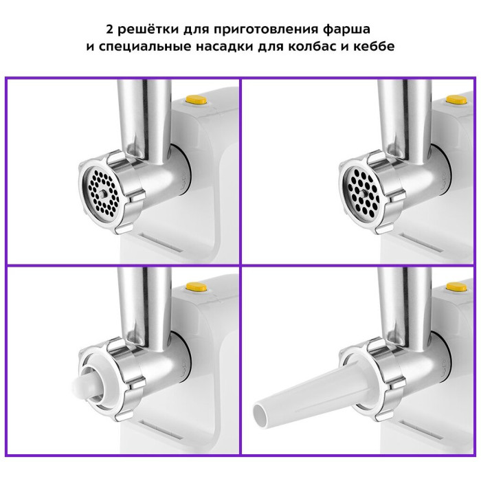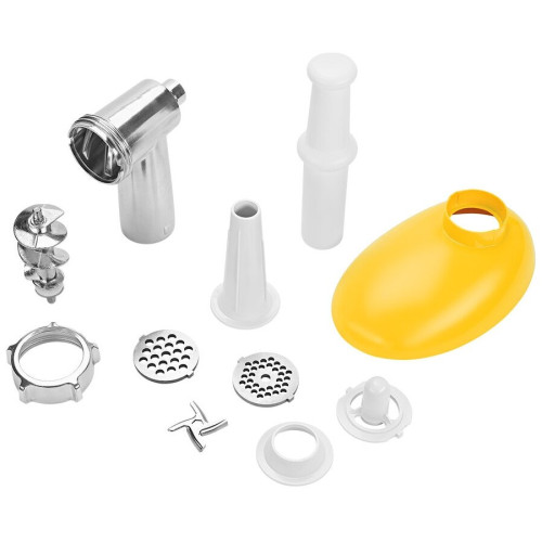 Комплектация 1. Моторный блок — 1 шт. 2. Загрузочный блок — 1 шт. 3. Загрузочный лоток — 1 шт. 4. Толкатель — 1 шт. 5. Шнек — 1 шт. 6. Насадка для кеббе — 1 шт. 7. Крышка насадки для кеббе — 1 шт. 8. Насадка для колбас — 1 шт. 9. Нож — 1 шт. 10. Кольцевая гайка — 1 шт. 11. Решетка с отверстиями 5 мм — 1 шт. 12. Решетка с отверстиями 7 мм — 1 шт. 13. Руководство по эксплуатации — 1 шт. 14. Коллекционный магнит — 1 шт.* *опционально