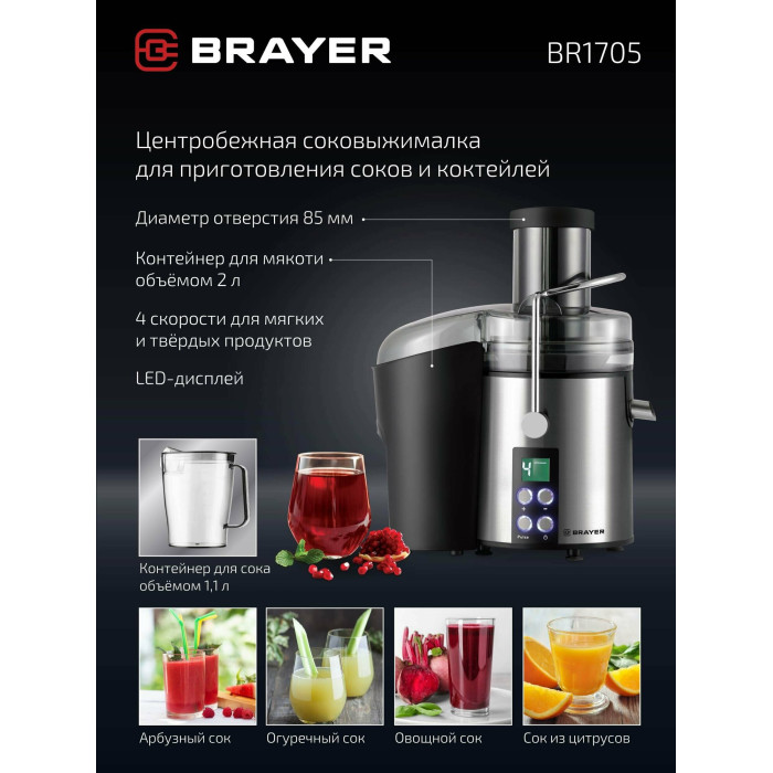 Контейнер для мякоти объемом 2 л. Контейнер для сока объемом 1,1 л.