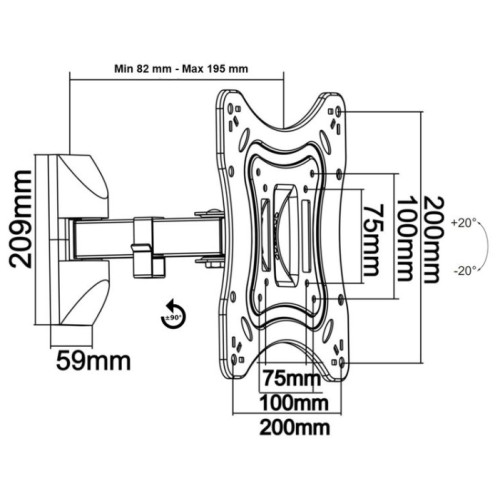 наклон: +20°~-20°; поворот: -90°~+90°; отступ от стены: 82~195 мм