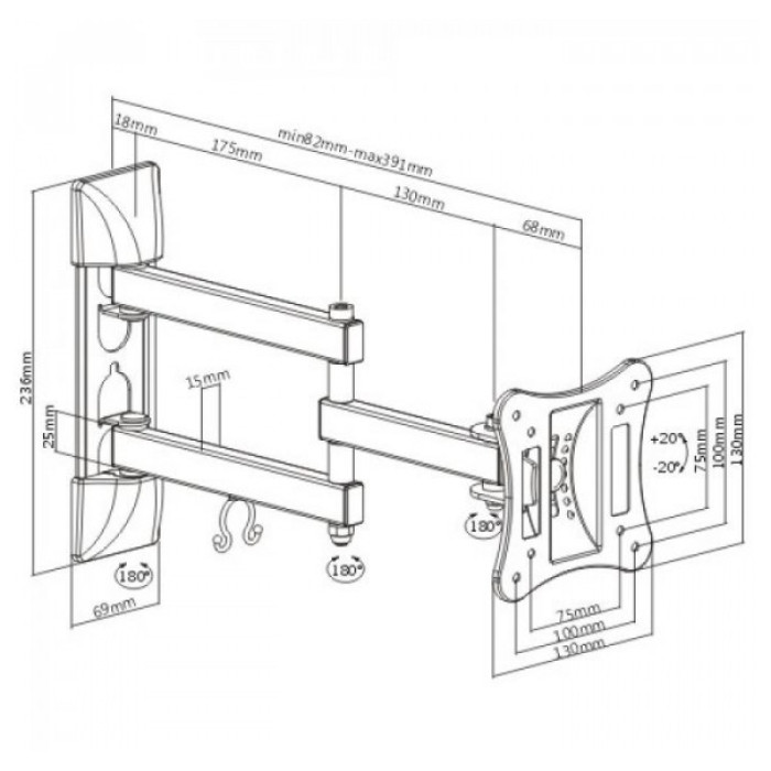 наклон: +20°~-20°; поворот: 180°; отступ от стены: 82 - 391 мм; кабель-канал