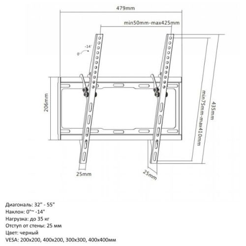 наклон: 0° ~-14°; отступ от стены: 25 мм