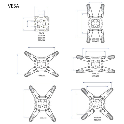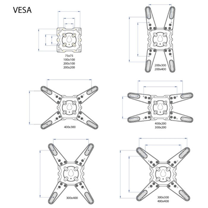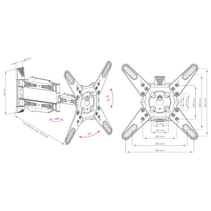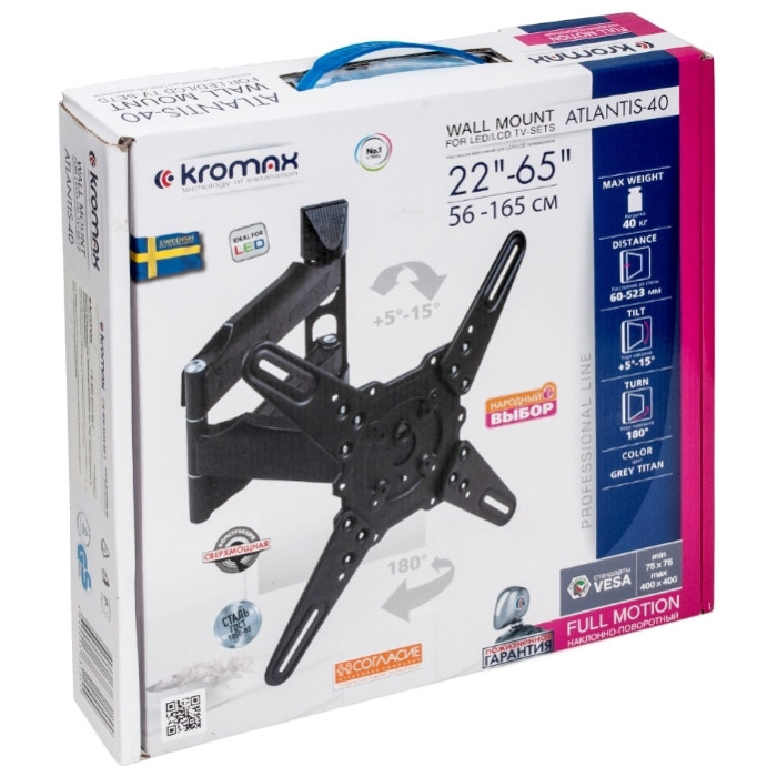 регулировка наклона и вращения экрана, угол наклона +5°-15°, угол поворота 180°, возможность вращения экрана на ±5° относительно стены, расстояние от стены 60-523 мм, универсальная система крепления, декоративные накладки, кабель-канал
