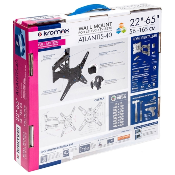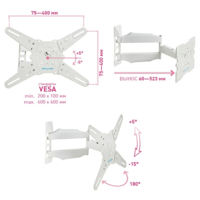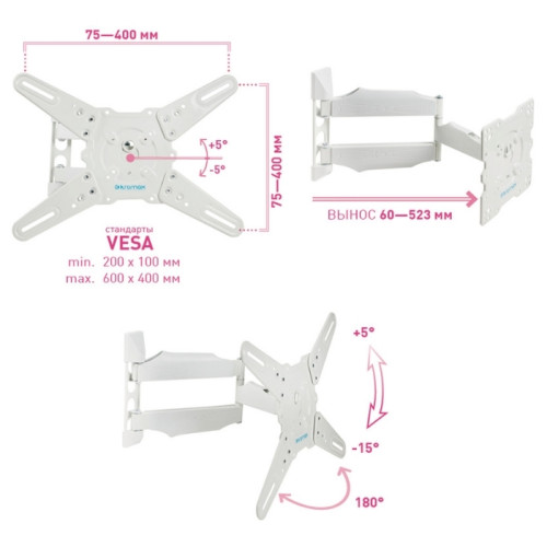 регулировка наклона и вращения экрана, угол наклона +5°-15°, угол поворота 180°, возможность вращения экрана на ±5° относительно стены, расстояние от стены 60-523 мм, универсальная система крепления, декоративные накладки, кабель-канал
