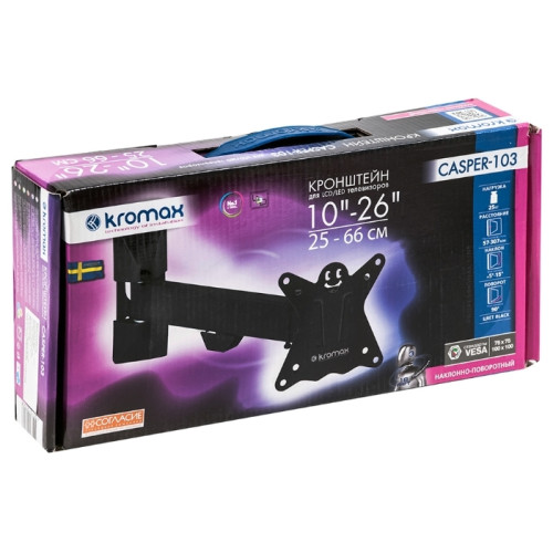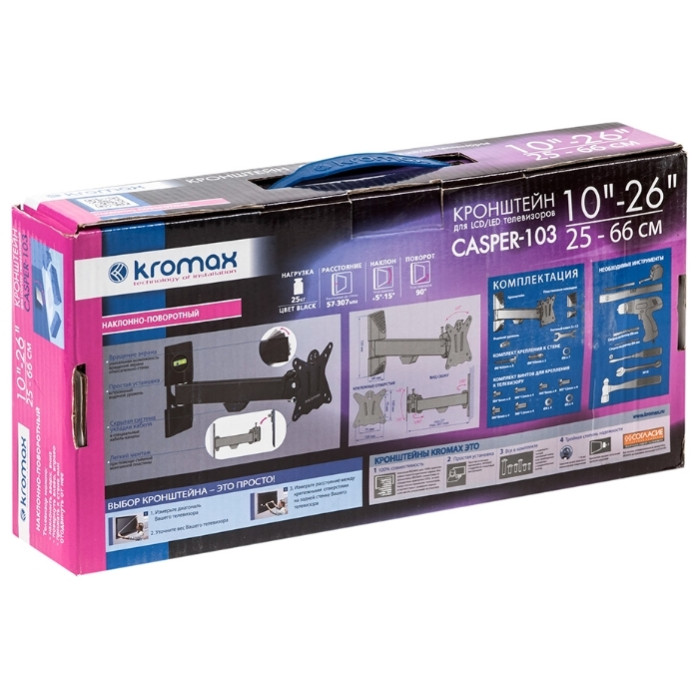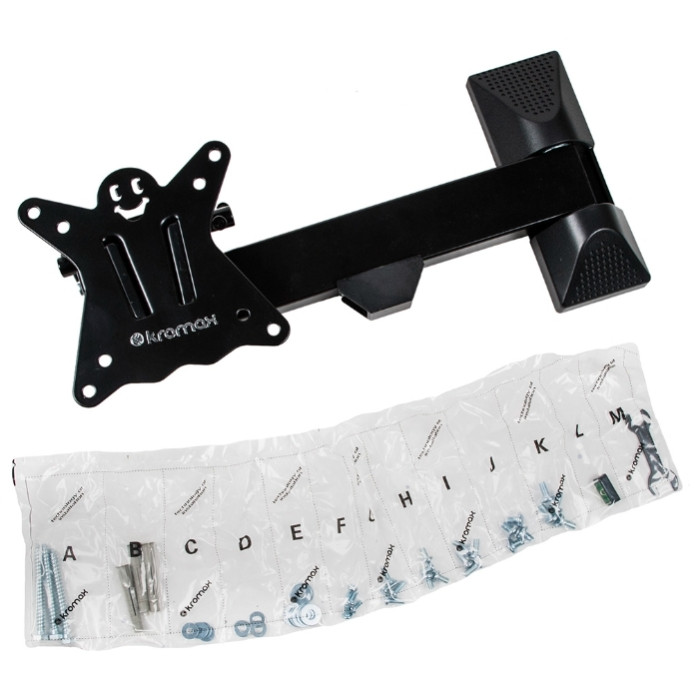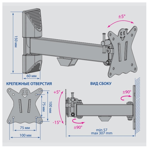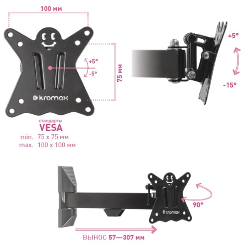 угол наклона +5 -15°, угол поворота 180°, вращение экрана ±5°, уровень в комплекте, декоративные накладки и кабель-канал, регулировка наклона и вращение экрана