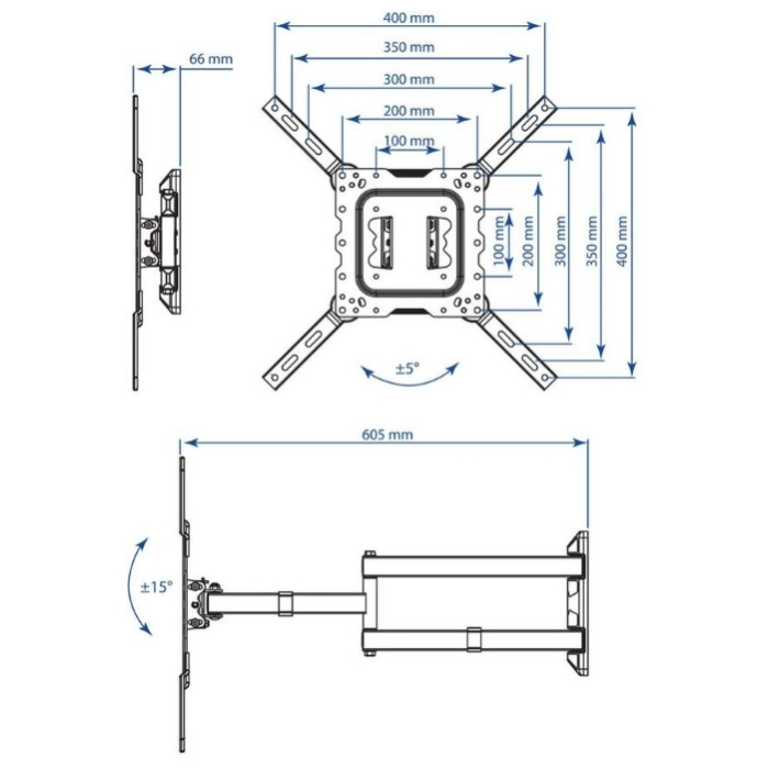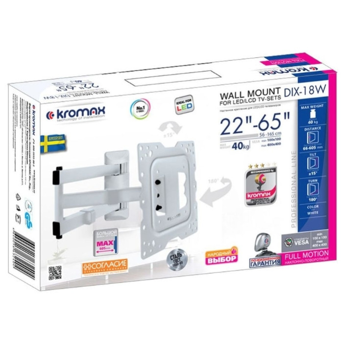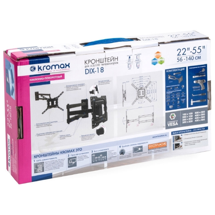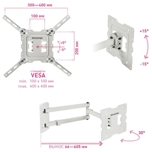 вращение экрана на ±5° относительно стены, легкий монтаж, регулировка наклона и вращение экрана, декоративные накладки и кабель-канал