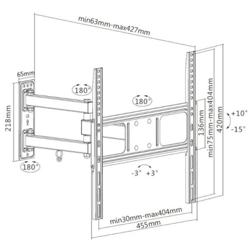 наклон до 15 градусов, подъем до 10 градусов, поворот ±90 градусов