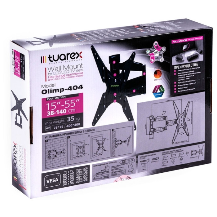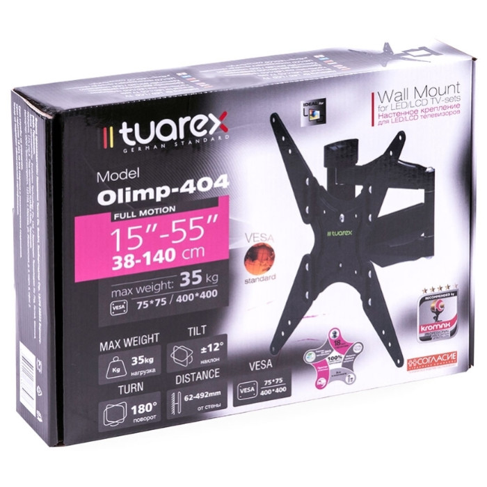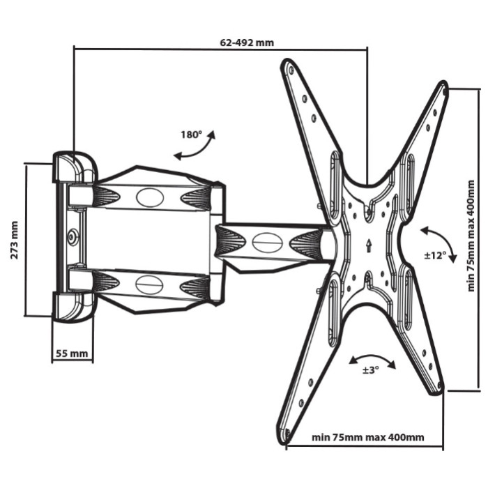 съемная монтажная пластина, корректировка экрана ±3°, наклон ±12°, поворот 180°, расстояние от стены 62-492 мм, кабель-канал