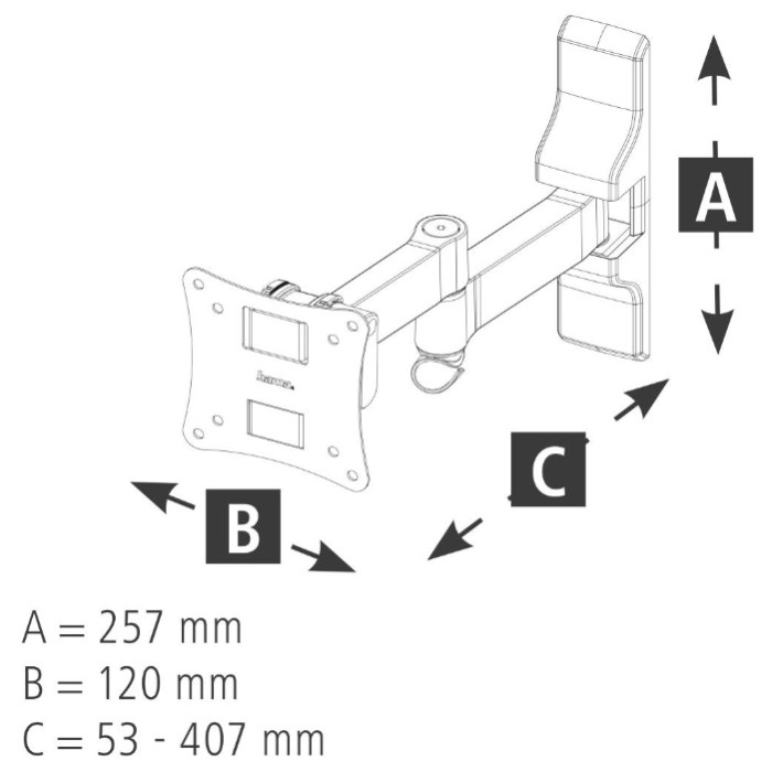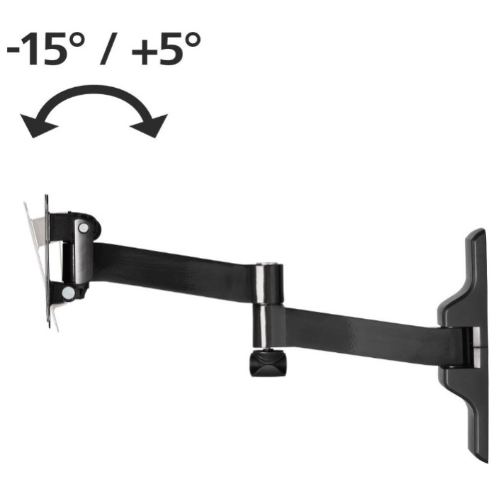 расстояние от стены от 5.3 см до 40.7 см; угол наклона вниз - 15° и вверх +5°; угол поворота влево/вправо 180°; вращение до 3°