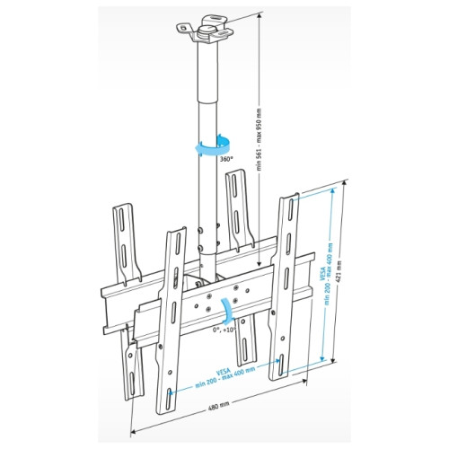 расстояние от потолка 561-950 мм, угол наклона 0°, 10°, угол поворота 360°