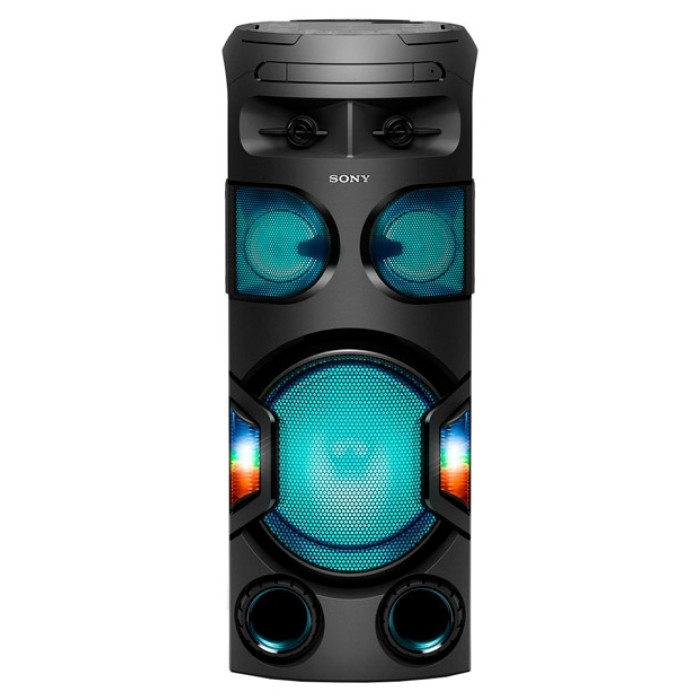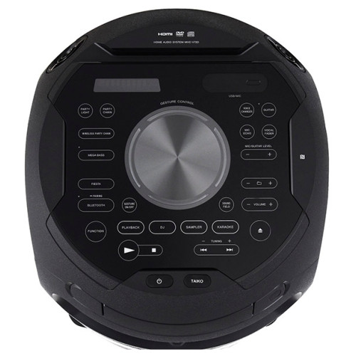 четырехполосная акустическая система с двойным фазоинвертором; ручка и колесики для удобства транспортировки; панель управления с защитой от брызг; световые эффекты; управление жестами; голосовое управление; комплектация: основной блок, пульт дистанционногоуправления, батарейки типа R03 (размер AAA) 2 шт., внешняя FM-антенна, шнур питания переменного тока; NFC