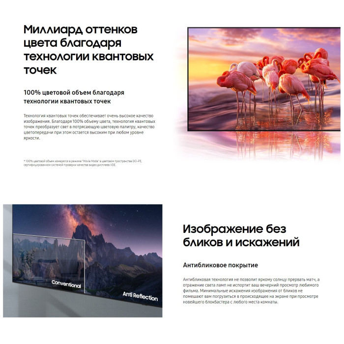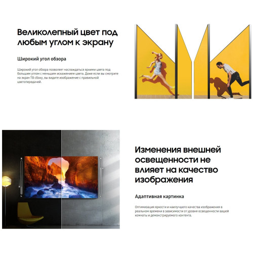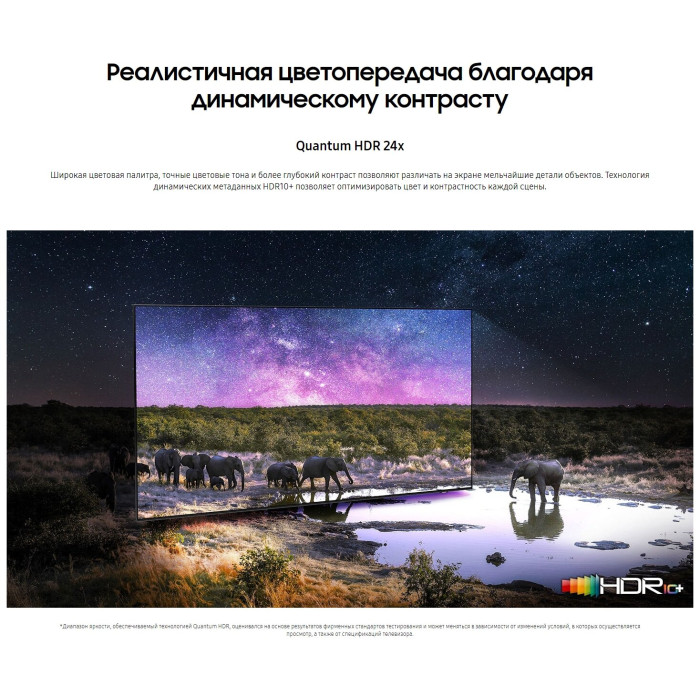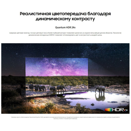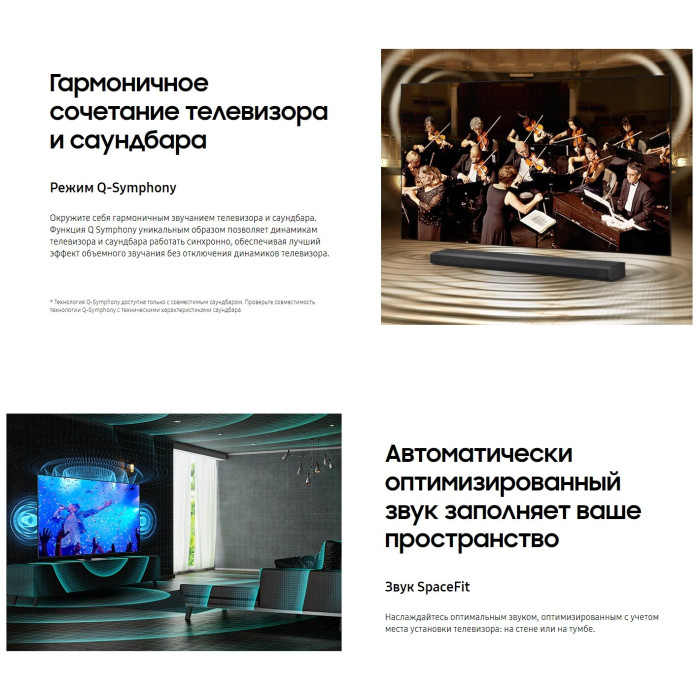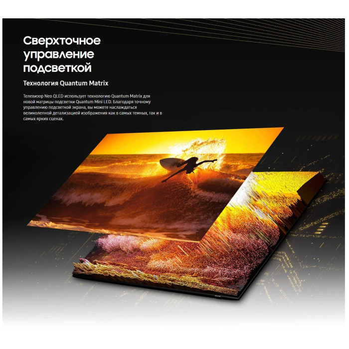 процессор Neo Quantum 4K; расширенный динамический диапазон Quantum HDR 24x; динамическая контрастность Quantum Matrix; тип затемнения Supreme UHD Dimming; звук, следующий за объектом на экране, OTS; ОС Tizen 6.0; поддержка проигрывателя и камеры 360 VR; игровые режимы ALLM / FreeSync Premium Pro; режим режиссера Filmmaker Mode; поддержка Wireless Dex; Multi-View; Motion Xcelerator Turbo+