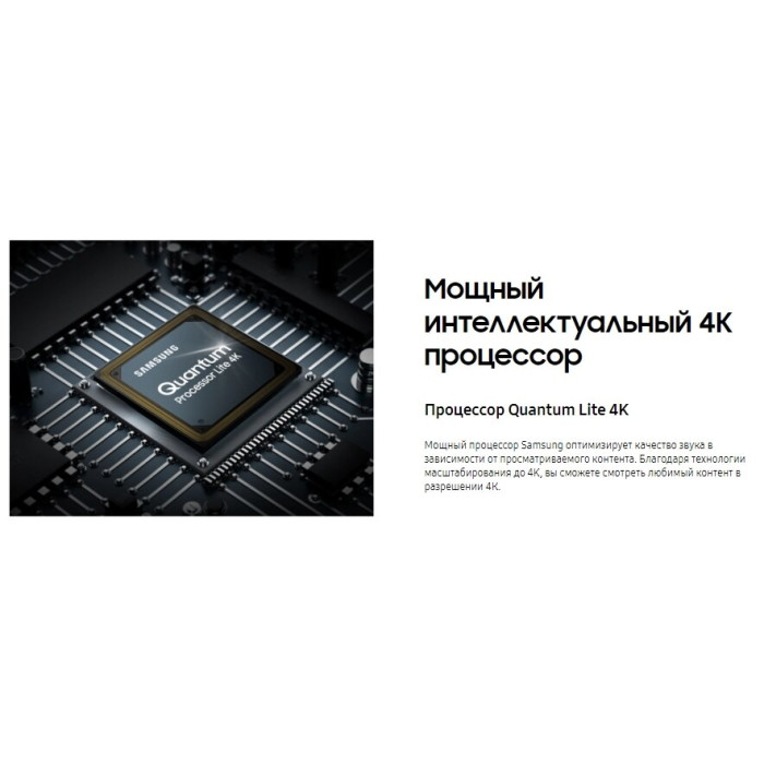 процессор Quantum Lite 4K; технология расширенного динамического диапазона Quantum HDR; подсветка Supreme UHD Dimming и Dual LED; поддержка Sound Mirroring; OTS Lite; Tap View; Multi View; Digital Clean View; Motion Xcelerator; Game Motion Plus; в комплекте: настольная подставка, пульт ДУ, кабель питания, документация