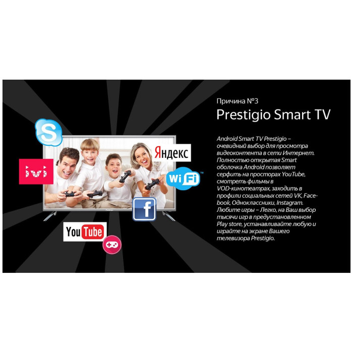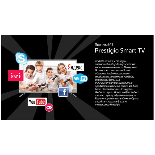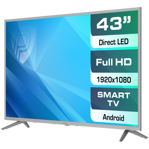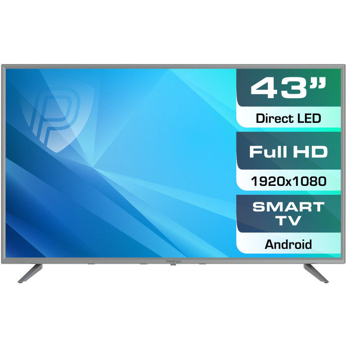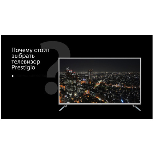 Телевизор Prestigio PTV43SS04Y_CIS_ML тёмно-серый металл (1920x1080) TFT LED, 250cd/m2, USB, HDMI, VGA, RCA, CI slot, Optical, Multimedia player, Smart 1+8Gb, DVB-T2/T/C/S2, 75W, RT2841, 2x6W, silver