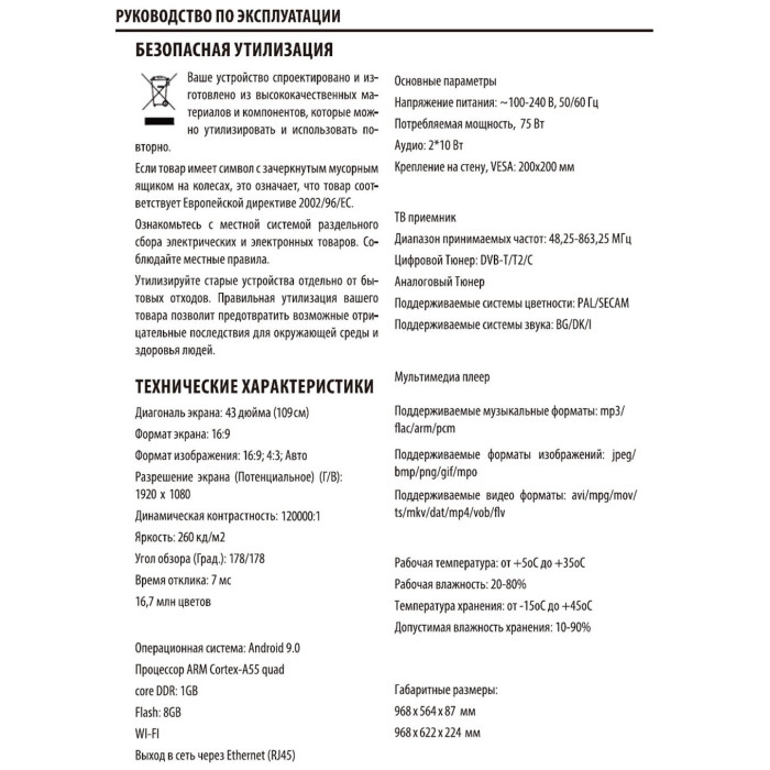 диагональ: 40"-45", диагональ (точно): 43 ", Разрешение HD: Full HD, частота обновления экрана: 60 Гц, технология экрана: LED, Поддержка цифрового ТВ: DVB-T2, DVB-C, DVB-T, Платформа Smart TV: Android, год создания модели: 2022