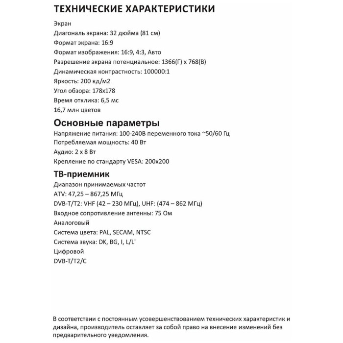 диагональ: 32"-39", диагональ (точно): 32 ", Разрешение HD: HD, частота обновления экрана: 50 Гц, технология экрана: LED, Поддержка цифрового ТВ: DVB-T2, DVB-C, DVB-T, Платформа Smart TV: Салют ТВ, беспроводная связь: Wi-Fi, Количество входов HDMI: 2