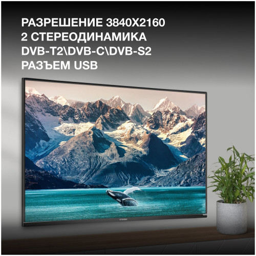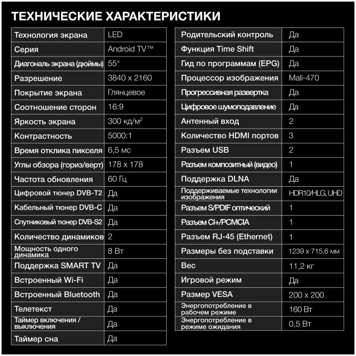 Разрешение HD: 4K UHD, частота обновления экрана: 60 Гц, технология экрана: HDR, LED, Поддержка цифрового ТВ: DVB-C, DVB-S2, DVB-T, DVB-T2, аналоговый (PAL, SECAM, NTSC), нет, Платформа Smart TV: Android TV, беспроводная связь: Bluetooth, Wi-Fi, Количество входов HDMI: 3, особенности: DLNA, EPG, Time Shift, голосовое управление, игровой режим, таймер сна, телетекст