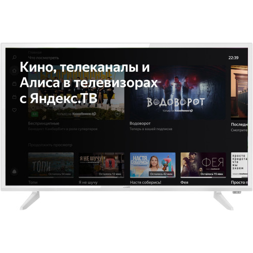 диагональ: 32"-39", диагональ (точно): 32 ", Разрешение HD: 720p HD, частота обновления экрана: 60 Гц, технология экрана: LED, Поддержка цифрового ТВ: DVB-C, DVB-S2, DVB-T2, нет, Платформа Smart TV: Яндекс ТВ, беспроводная связь: Bluetooth, Wi-Fi, Количество входов HDMI: 2, особенности: голосовое управление