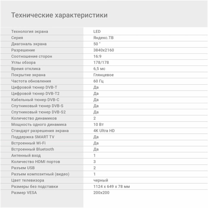диагональ: 46"-50", диагональ (точно): 50 ", частота обновления экрана: 60 Гц, технология экрана: LED, Поддержка цифрового ТВ: нет, Платформа Smart TV: Яндекс ТВ, беспроводная связь: Wi-Fi, особенности: EPG