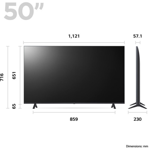 диагональ: 46"-50", диагональ (точно): 50 ", Разрешение HD: 4K UHD, частота обновления экрана: 60 Гц, технология экрана: LED, Поддержка цифрового ТВ: DVB-C, DVB-S2, DVB-T, DVB-T2, Платформа Smart TV: webOS, беспроводная связь: Bluetooth, Wi-Fi, Экосистема Умного дома: LG Smart ThinQ, Количество входов HDMI: 3, особенности: таймер сна