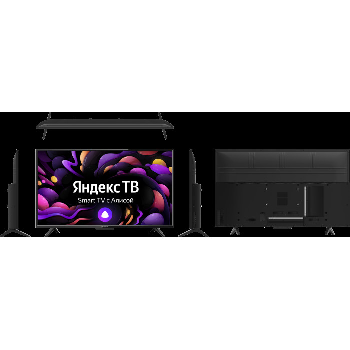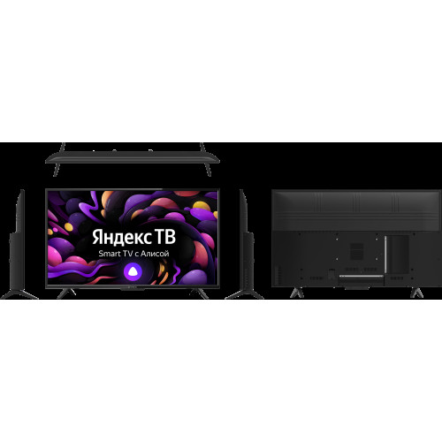 SMART TV с Яндекс-платформой; 4-х ядерный мощный смарт процессор; голосовой ассистент Алиса; поддержка DRM; Супертонкая фронтальная рамка; тонкий корпус с оптической глубиной 20мм; подписка Яндекс Плюс на 3 мес. Диагональ 38,5" (99 см). Разрешение 1366x768. Стандарт разрешения экрана HD. Соотношение сторон 16:9. Тип подсветки Direct LED. Яркость экрана 250 кд/м2. Контрастность 3000:1. Время отклика матрицы 8 мс. Углы обзора 178/178 град. Частота обновления 60 Гц. Цифровой тюнер DVB-T2 есть. Кабельный тюнер DVB-C есть. Спутниковый тюнер DVB-S2 есть. Мощность акустики 2 x 10 Вт. Акустическая схема 2.0. Встроенный Wi-Fi есть. Встроенный Bluetooth есть. Операционная система Яндекс. ТВ. Поддержка SMART TV есть. Объем оперативной памяти 1 ГБ. Объем встроенной памяти 8 ГБ. Голосовой помощник есть. Коммутация USB2.0 x2; HDMI x2; LAN; CI+; композитный; компонентный; наушники. Поддержка форматов USB: DVD видео (VOB), MPEG2/MPEG4 (AVI, MPG), H.264 (MKV, MPG), H.265 HEVC, Dolby Digital+, AC3, mp3, JPG. Поддержка жестких дисков (с доп. питанием) до 1Тб. VESA 200x100.