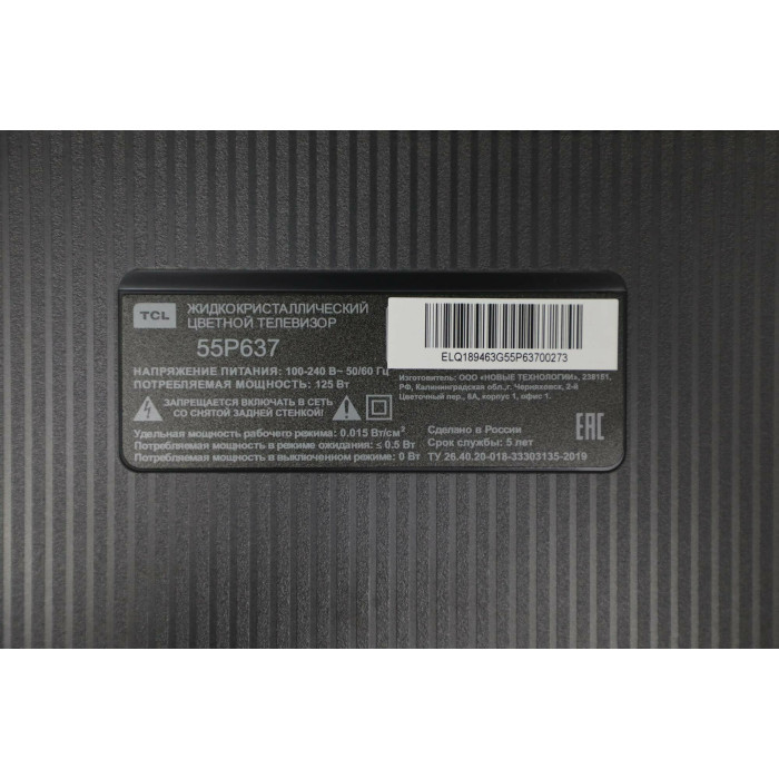 Телевизор LED TCL 55P637 Жидкокристаллический телевизор TCL 55P637 станет эпицентром вашего домашнего очага и мультимедийных развлечений. Корпус с тремя безрамочными сторонами позволяет смотреть ТВ в полноэкранном режиме и увеличивает угол обзора. Вы с удивлением обнаружите, насколько естественным ощущается просмотр ТВ на экране с диагональю 55 дюймов. Благодаря потрясающему 4K дисплею, в котором использован новейший стандарт видео с высоким динамическим диапазоном, отображение тонов оптимизирует качество изображения, а диапазон тонов, яркость и контрастность значительно улучшены для каждого кадра. Более детализированный контент делает ваш просмотр интересным и приятным. Эксклюзивная разработка TCL - динамическое усиление цвета - создана специально для того, чтобы автоматически оптимизировать яркость цвета. Собственный алгоритм расширяет традиционные границы цветовой палитры, обеспечивая яркий и улучшенный опыт просмотра видео. Новый четырехъядерный процессор улучшает общую производительность аппаратного и программного обеспечения, он был создан, чтобы вывести развлечения на новый уровень. Микросхема включает в себя алгоритм TCL, обрабатывающий контент в реальном времени, который определяет окружающую среду и подстраивает под нее картинку и звук. Изображение оптимизируется в соответствии с содержимым: вы сможете насладиться более синим океаном и более пышными лесами. В то же время, качество звука регулируется в зависимости от громкости: устраняется искажение сигнала и звука динамиков и вне зависимости от уровня звука создается атмосфера погружения. Наслаждайтесь наиболее реалистичным звучанием с Dolby Audio. Технологии разработаны для того, чтобы вы смогли погрузиться в каждую сцену с невероятной чистотой звучания, более четкими диалогами и неповторимой детализацией. Характеристики Экран Диагональ 55" Разрешение HD 4K UHD Разрешение 3840x2160 Форматы HDR HDR10, HLG Тип ЖК Формат телевизора 16:9 Тип подсветки Direct LED Тип матрицы экрана VA Технология экрана HDR, LED Яркость 270 кд/м2 Динамическая контрастность 5000:1 Угол обзора 178 градусов Частота обновления экрана 60 Гц Звук Функции звука Dolby Audio, стереозвук Суммарная мощность звука 20 Вт Количество динамиков 2 Разъемы и интерфейсы Разъемы и интерфейсы AV-вход, Ethernet - RJ-45, USB Type-A, вход HDMI x 3, выход на наушники, слот CI Версия интерфейса HDMI 2.1 Беспроводная связь Bluetooth, Chromecast, Wi-Fi Стандарт Wi-Fi 802.11ac (Wi-Fi 5) Мультимедиа Платформа Smart TV Google TV Поддержка мультимедиа AAC, AC3, AV1, BMP, FLAC, H.264, HEVC (H.265), JPEG, MP3, MPEG, MPEG2, MPEG4, OGG, PNG, VP9, WMA ТВ-тюнер DVB-C, DVB-S, DVB-S2, DVB-T, DVB-T2 Дополнительные функции Особенности DLNA, EPG, Time Shift, запись видео (PVR) Стандарт крепления VESA 200x200 Голосовой помощник Amazon Alexa, Google Assistant Запись видео на встроенную память/USB-накопитель Потребляемая мощность 125 Вт Год создания модели 2022 Габариты Размеры с подставкой (ШxВxГ) 1226x766x265 мм Размеры без подставки (ШxВxГ) 1226x711x81 мм Дополнительная информация комплектация: документация, ножка подставки х 2 шт, пульт ДУ Срок службы 5 лет Гарантийный срок 12 мес, Гарантия СЦ производителя