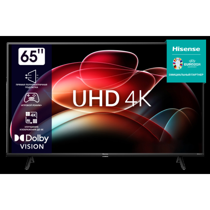 Получите исключительно детализированное качество 4K для всего вашего любимого контента Наслаждайтесь любимым сериалом без перерыва, погрузитесь в новейшие фильмы или проживите каждый момент самых захватывающих игр. Побалуйте себя телевизором Hisense 4K, который перенесет вас прямо в центр событий. Полностью черное изображение от края до края В отличие от более распространенных светодиодных дисплеев с боковым освещением, Direct Full Array равномерно распределяет свет по экрану, обеспечивая равномерный и стабильный черный цвет. Точная настройка каждого пикселя Pixel Tuning динамически уточняет изображения, обеспечивая более четкие детали и более насыщенные слои как в темных, так и в ярких областях. Смотрите содержимое в потрясающих деталях Hisense TV поддерживает декодирование HDR10+. Хотите ли вы узнать о новейшем контенте или просто насладиться любимыми играми с эффектом погружения, этот телевизор обеспечивает оригинальный контент с улучшенной детализацией теней и более яркими бликами. Модель 65А6К EAN 6942147491539 Материал/цвет передней крышки пластик / черный Материал/цвет задней крышки пластик / черный Конструкция/материал рамы Безрамочный / Металл Тип телевизора Умный телевизор UHD 4K тип панели IPS антибликовая панель Нет Соотношение сторон 16:9 Время отклика панели (мс) 8 мс Размер экрана (диагональ) 65 дюймов Размер экрана (диагональ, см) 164 см Видимая площадь (см^2) 11478,1 см^2 максимальное разрешение Ультра HD 3840×2160 Угол обзора 178 место глубина цвета 8 бит + FRC Глубина цвета TCON 8 бит + FRC Частота вертикальной синхронизации 60 Гц Контраст 1200:1 Яркость (ниты) (типичное значение) 300 Процессор Четырехъядерный/MT9602 Мощность звука (выход) 2*10 Вт Вес (включая упаковку) 24,5 Вес изделия (с основанием) 16,7 Вес продукта (без базы) 16,5 Вес упаковки 6 кг Вес пенопласта в упаковке 1,25 кг Ориентация упаковки (горизонтальная/вертикальная) Вертикальный Размеры упаковки (ДхГхВ) 1602×161×996 Размеры изделия с основанием (ДхГхВ) 1452×300×896 Размеры изделия без базы (ДхГхВ) 1452×74×834 расстояние между ногами 1164мм Ширина рамки (сверху/сбоку/снизу) 3/3/15.7 минимальное базовое расстояние 530мм Soporte VESA compatible 400×300 мм